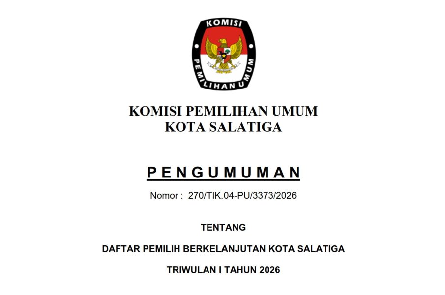 Komisi Pemilihan Umum Kota Salatiga, melalui perantara Kantor Pelayanan Kekayaan Negara dan Lelang (KPKNL) Semarang akan melaksanakan Lelang Non Eksekusi Wajib Barang Milik Negara berupa 1 (satu) paket Barang Persediaan Pasca Pemilu Tahun 2024. Adapun Daftar Barang Milik Negara (BMN) berupa Barang Persediaan Pasca Pemilu Tahun 2024 dapat di lihat di sini