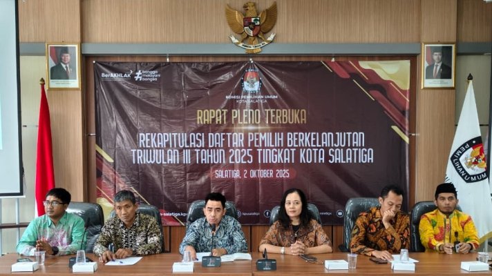 Salatiga, 2 Oktober 2025 — Komisi Pemilihan Umum (KPU) Kota Salatiga telah menyelenggarakan Rapat Pleno Terbuka Rekapitulasi Daftar Pemilih Berkelanjutan (DPB) Tingkat Kota Salatiga Triwulan III Tahun 2025 pada hari Kamis, 2 Oktober 2025, bertempat di Aula KPU Kota Salatiga. Rapat yang dibuka oleh Ketua KPU Kota Salatiga - Yesaya Tiluata dan dalam sambutannya menekankan bahwa setelah Pemilu, KPU terus melaksanakan tugas pemutakhiran data pemilih dan sosialisasi kepada masyarakat. Rapat Pleno yang diadakan setiap tiga bulan ini bertujuan untuk memastikan keakuratan data pemilih menjelang tahapan Pemilu selanjutnya yang akan dimulai pada pertengahan tahun 2027.