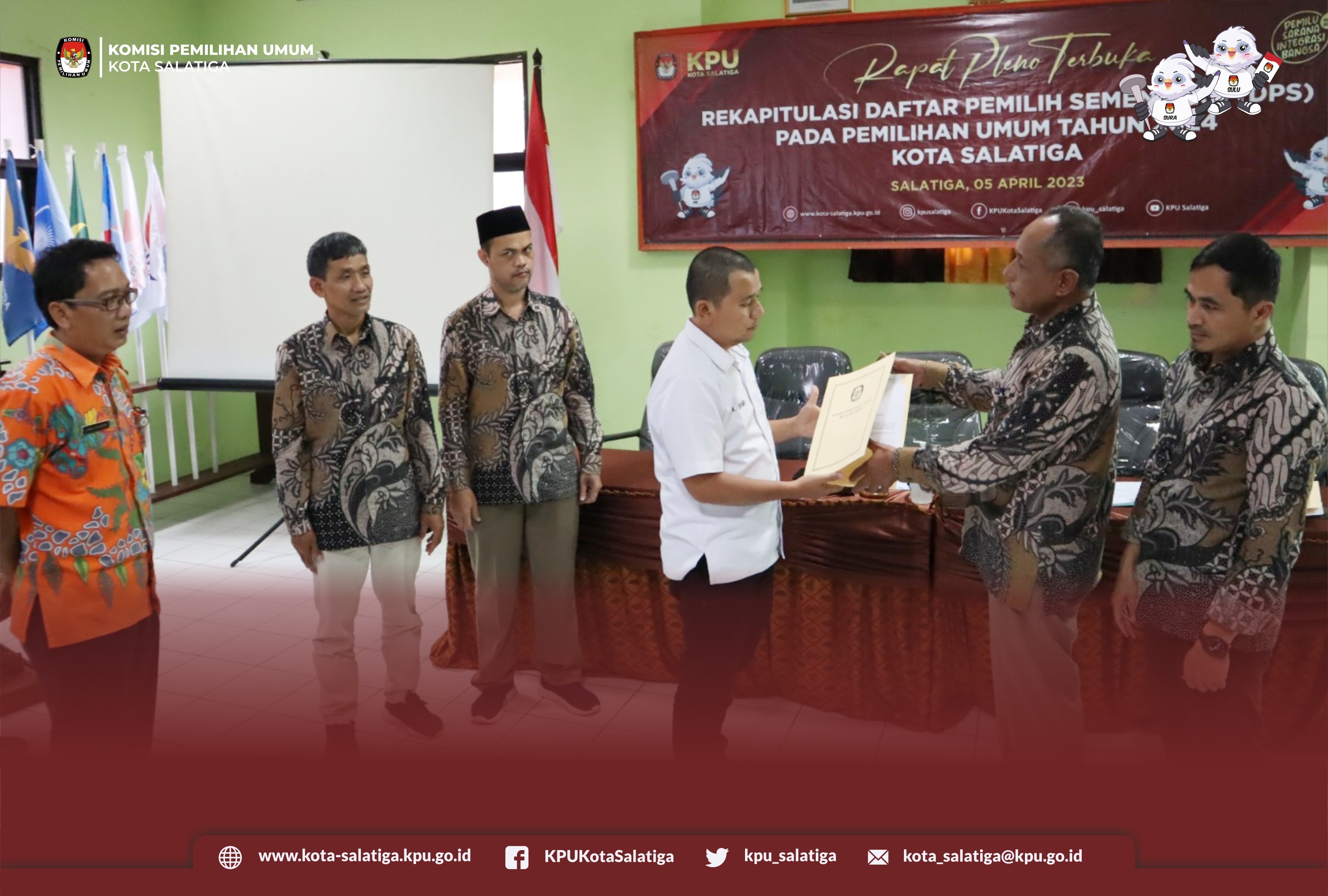 Sesuai dengan ketentuan Pasal 46 PKPU 7 Tahun 2023, pada penghujung acara, KPU Kota Salatiga menyampaikan Salinan Naskah Asli Berita Acara Pleno, Rekapitulasi DPS di tingkat KPU Kota Salatiga dan DPS by name kepada seluruh peserta yang hadir.