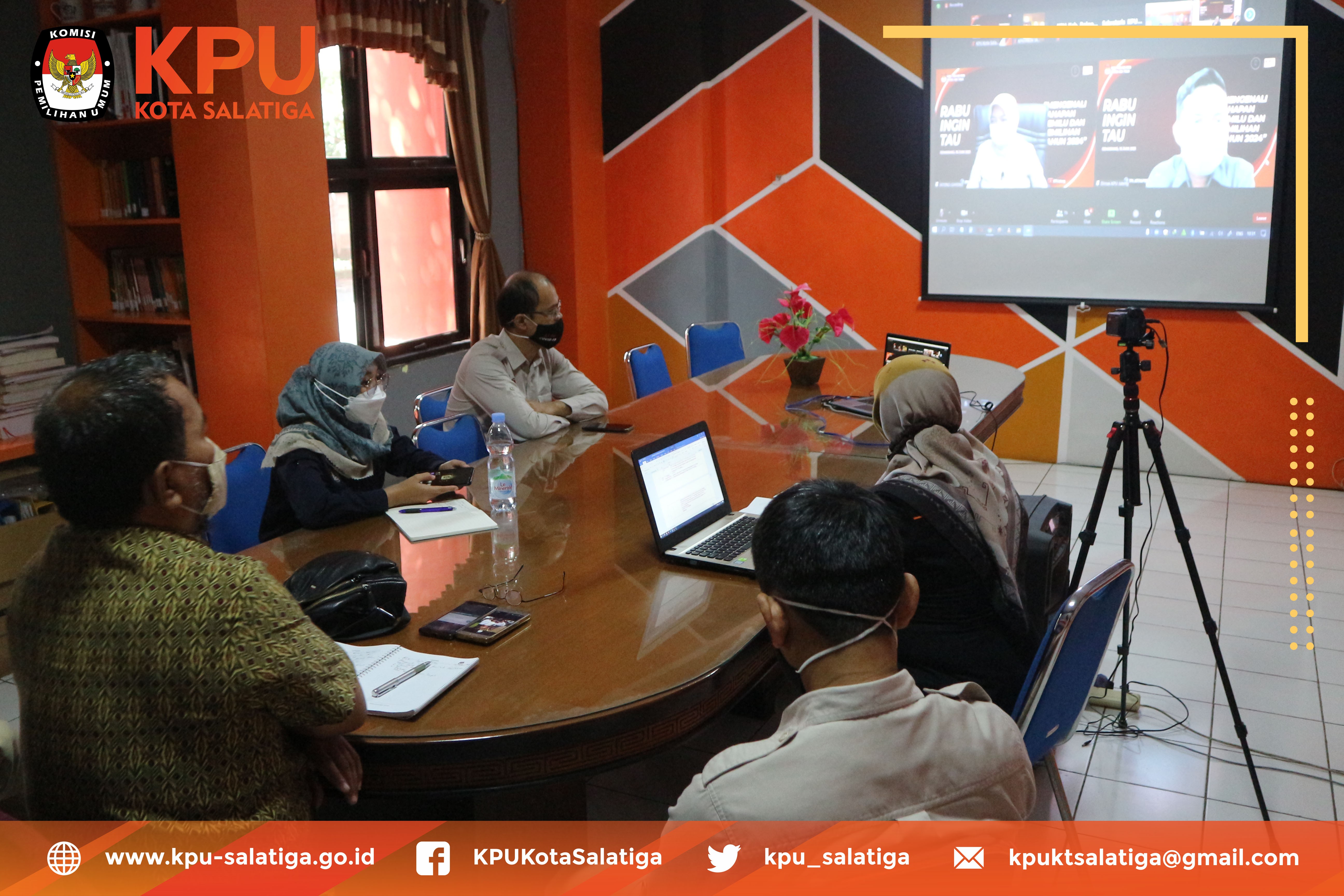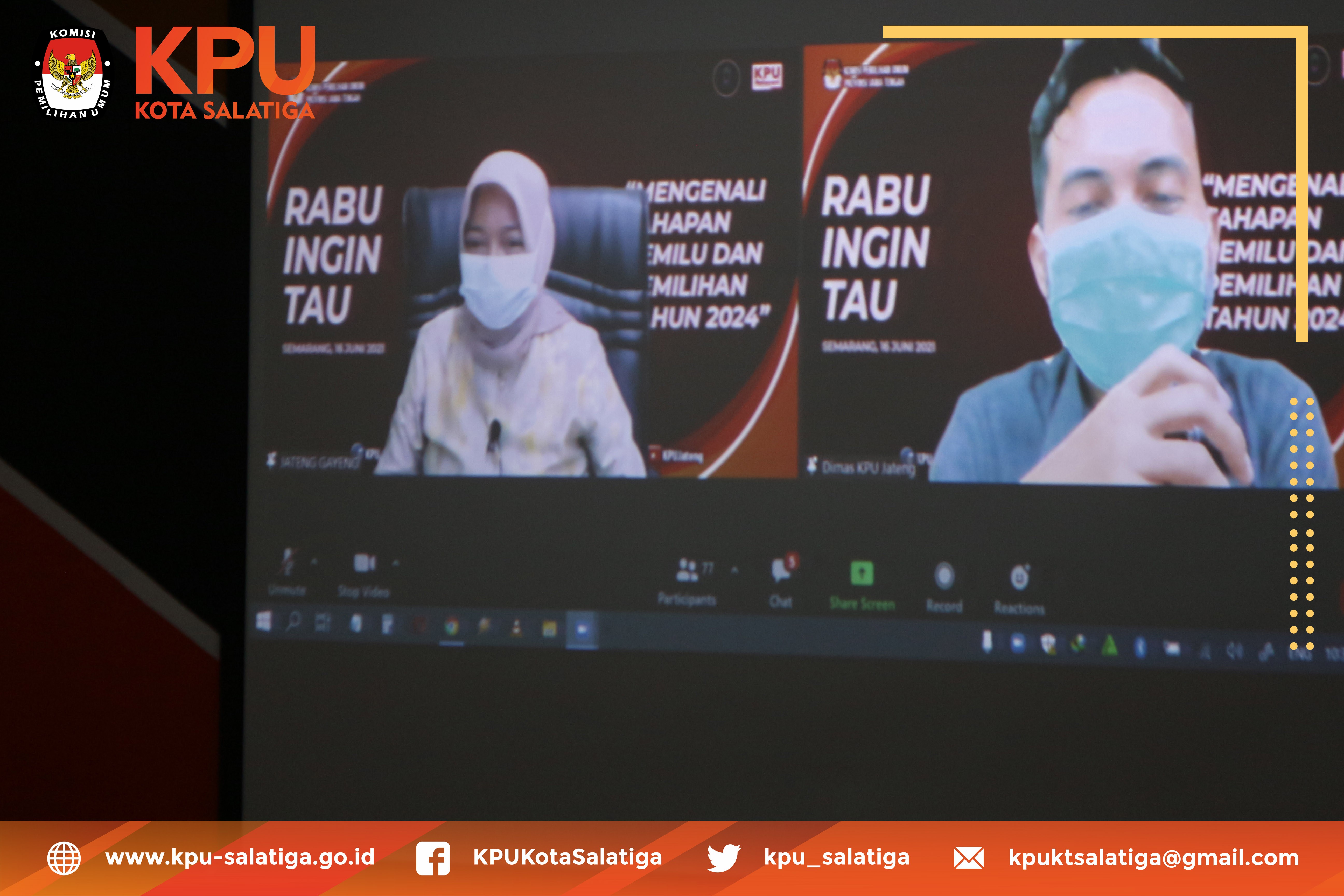 Rabu (16/6) bertempat di ruang RPP, Anggota KPU Kota Salatiga Divisi Teknis Penyelengaraan, bersama Kasubbag Teknis Hupmas dan CPNS mengikuti kegiatan Rabu Ingin Tahu (RIT) secara daring yang diselenggarakan oleh KPU Provinsi Jawa Tengah dengan mengambil tema ““Mengenali Tahapan Pemilu dan Pemilihan Tahun 2024”.