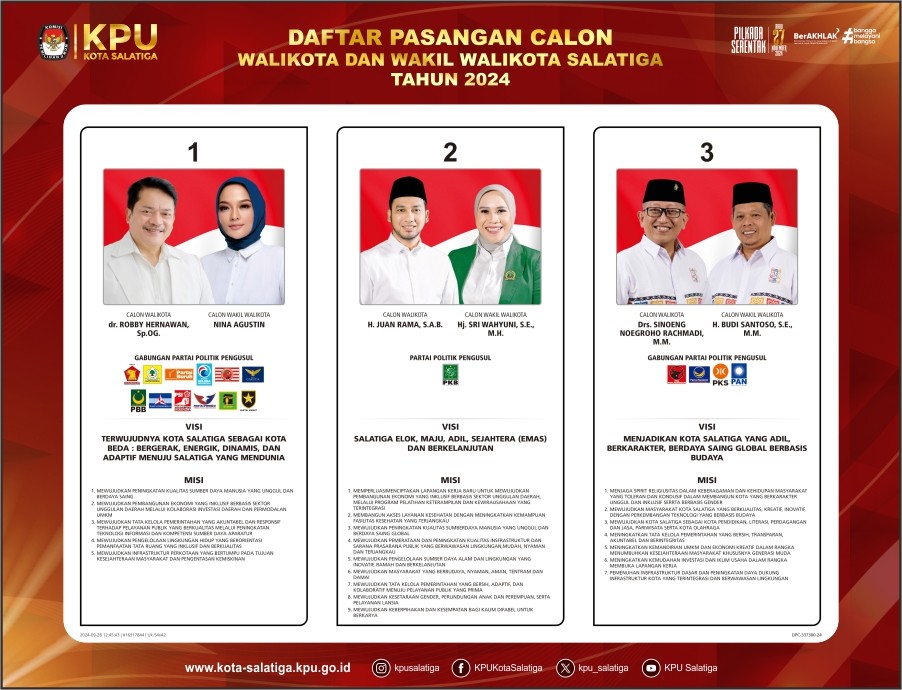 KPU Kota Salatiga mengumumkanan Daftar Pasangan Calon Walikota dan Wakil Walikota Salatiga Tahun 2024, Daftar Pasangan Calon disertai visi misi dapat diunduh pada tautan berikut ini: