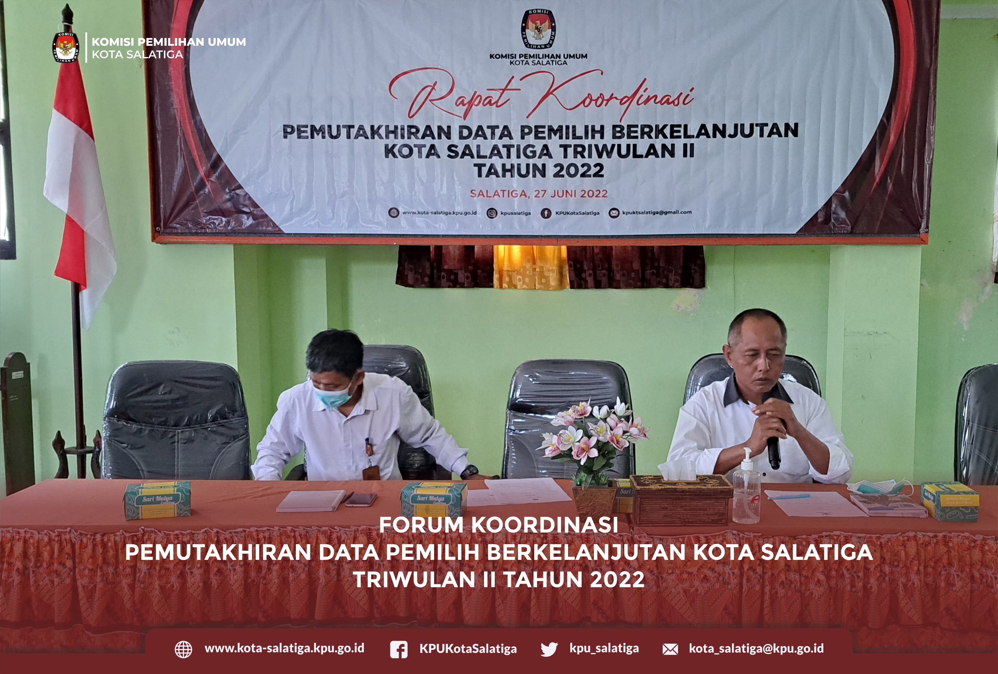 kota-salatiga.kpu.go.id - Hari ini, Senin (27/06), KPU Kota Salatiga menyelenggarakan forum koordinasi Pemutakhiran Daftar Pemilih Berkelanjutan (PDPB) Triwulan II Tahun 2022 di Aula Kota Salatiga . Forum koordinasi ini adalah forum kedua yang diselenggarakan sepanjang tahun 2022. Hadir dalam kegiatan tersebut segenap Komisioner dan Sekretariat KPU Kota Salatiga, Bawaslu, Kodim, Polres, Camat atau yang mewakili, Lurah atau yang mewakili, Partai Politik, dan segenap instansi daerah yang berkaitan dengan data pemilih.