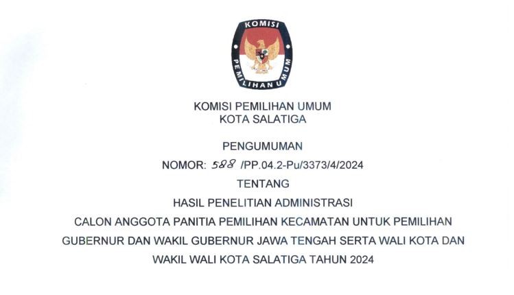 Sehubungan dengan Komisi Pemilihan Umum Kota Salatiga telah melaksanakan tahapan Penelitian Administrasi Calon Anggota Panitia Pemilihan Kecamatan untuk Pemilihan Gubernur dan Wakil Gubernur Jawa Tengah serta Wali Kota dan Wakil Wali Kota Salatiga Tahun 2024, disampaikan beberapa hal sebagaimana terlampir.