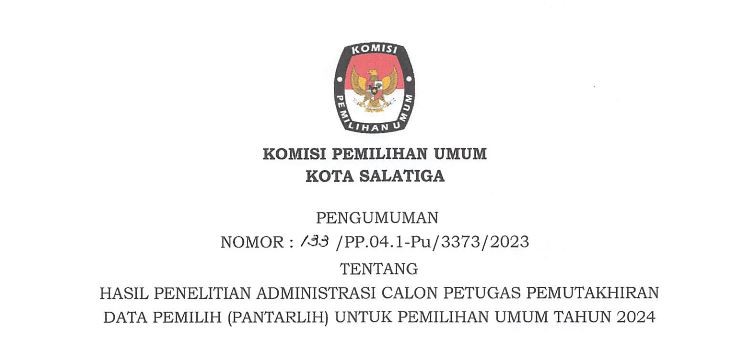 Berdasarkan Berita Acara Rapat Pleno Panitia Pemungutan Suara (PPS) Se- Kota Salatiga tentang Rapat Pleno Penetapan Hasil Penelitian Administrasi Calon Petugas Pemutakhiran Data Pemilih (Pantarlih) untuk Pemilihan Umum Tahun 2024, disampaikan hal-hal sebagai berikut :