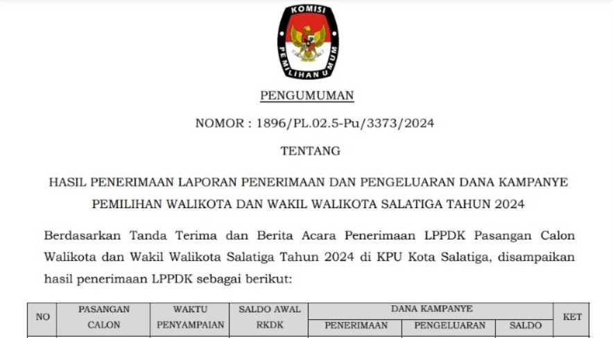 HASIL PENERIMAAN LAPORAN PENERIMAAN DAN PENGELUARAN DANA KAMPANYE PEMILIHAN WALIKOTA DAN WAKIL WALIKOTA SALATIGA TAHUN 2024