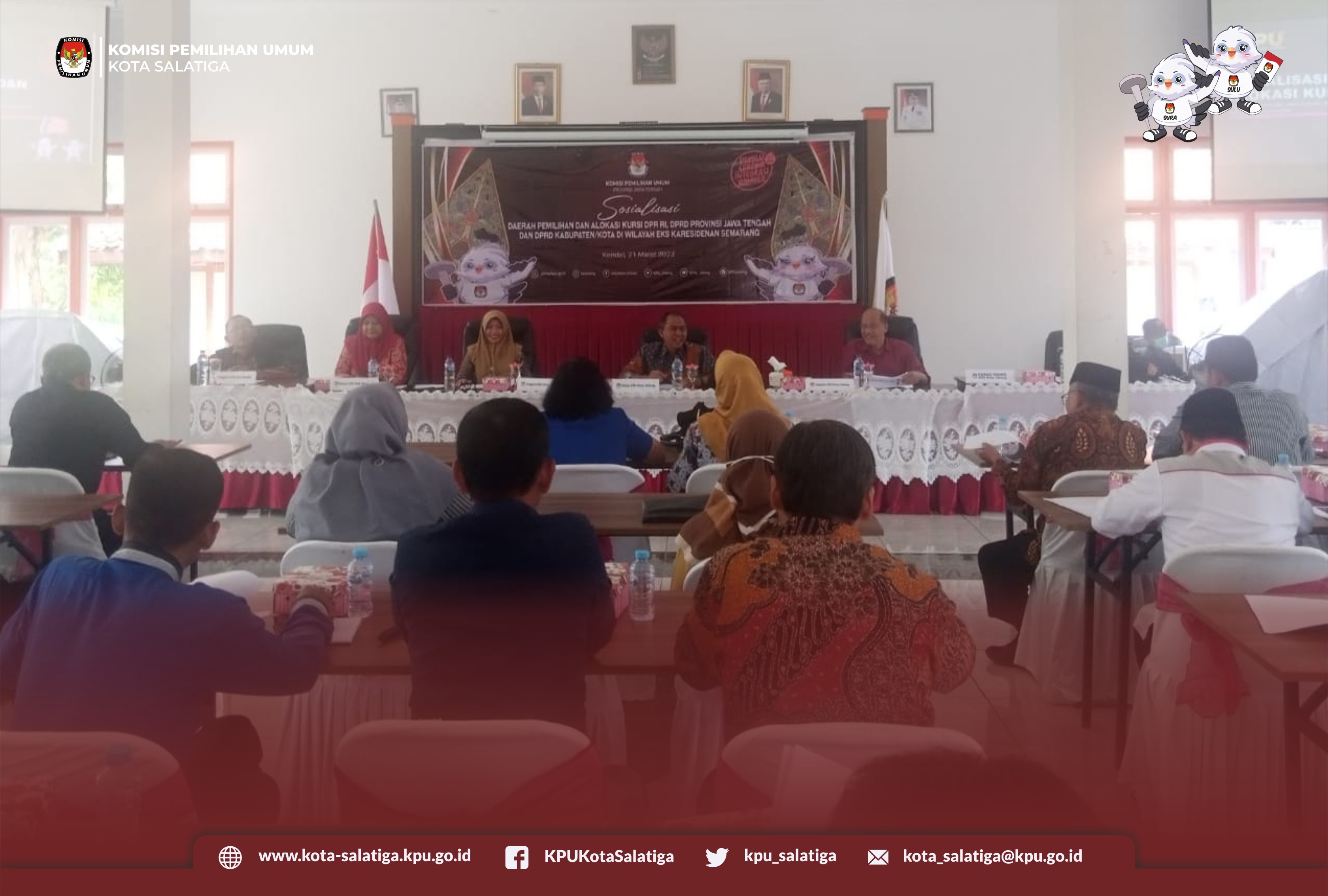 kota-salatiga.kpu.go.id Bertempat di Aula KPU Kabupaten Kendal, KPU Provinsi Jawa Tengah menggelar kegiatan Sosialiasi Daerah Pemilihan dan Alokasi Kursi Anggota DPR, DPRD Provinsi dan DPRD Kab/Kota dalam Pemilu 2024, Selasa, (21/3). Hadir dalam kegiatan ini adalah Ketua, Divisi Teknis penyelenggaraan Pemilu, Divisi Sosdiklihparmas dan SDM, dan Kasubbag Teknis KPU Kabupaten/Kota se –Eks Karesidenan Semarang. Kegiatan ini juga dihadiri oleh stakeholder yang ada di Kabupaten Kendal meliputi Bawaslu, Kodim, Polres, OPD, tokoh masyarakat dan insan media.