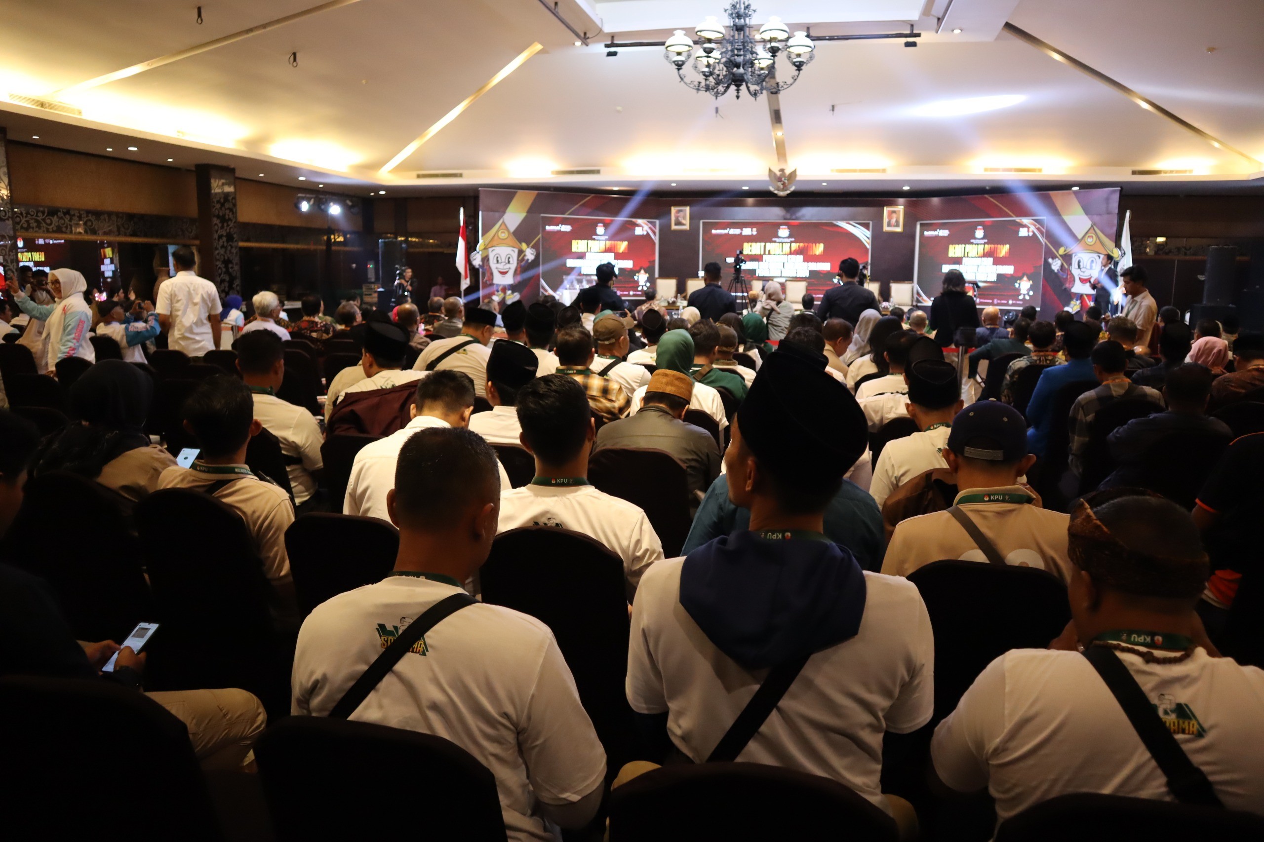 Riuh suara pendukung Pasangan Calon Walikota dan Wakil Walikota Salatiga berdengung ramai di ballroom Hotel Laras Asri Salatiga, Selasa (29/10). Sebulan sebelum hari pemungutan suara KPU Kota Salatiga menyelenggarakan debat publik pertama bagi ketiga Pasangan Calon Walikota dan Wakil Walikota Salatiga Tahun 2024. Pada kesempatan tersebut, Penjabat Walikota Salatiga, Yasip Khasani hadir bersama dengan jajaran Forkopimda dan sejumlah OPD. Masing-masing Pasangan Calon turut membawa lima puluh orang pendukung yang hadir untuk meramaikan suasana debat pertama.