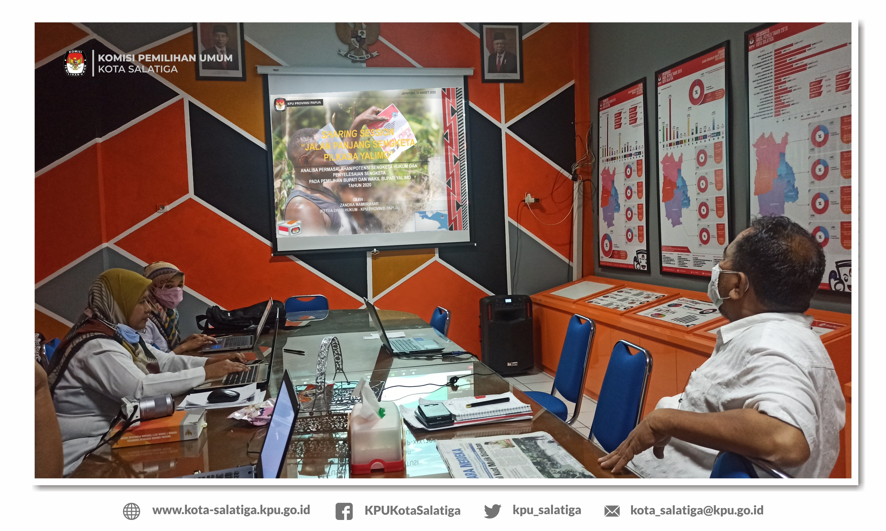 Jajaran Komisioner KPU Kota Salatiga beserta Kepala Sub Bagian Teknis Penyelenggaraan dan Kepala Sub Bagian Hukum dan Sumber Daya Manusia mengikuti Rapat Koordinasi bertajuk Sharing Session: Jalan Panjang Sengketa Pilkada Yalimo secara daring, Kamis (24/03). Kegiatan diselenggarakan oleh KPU Provinsi Jawa Tengah dengan menggandeng KPU Provinsi Papua dan KPU Kabupaten Yalimo sebagai narasumber.