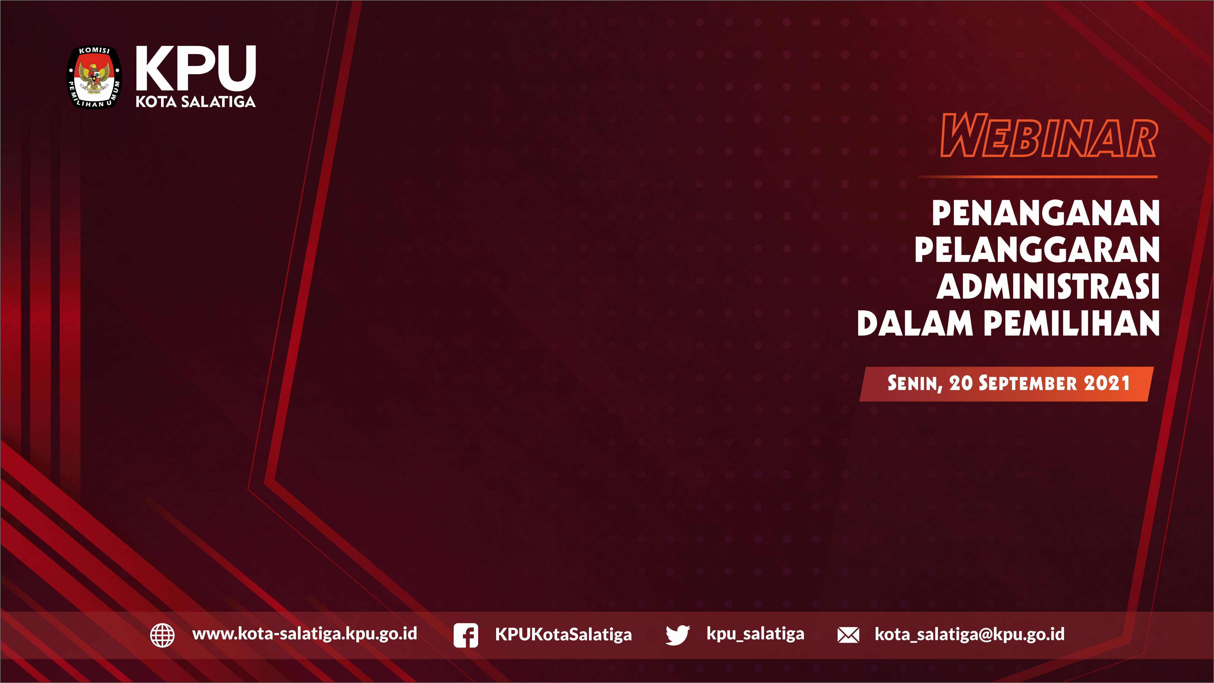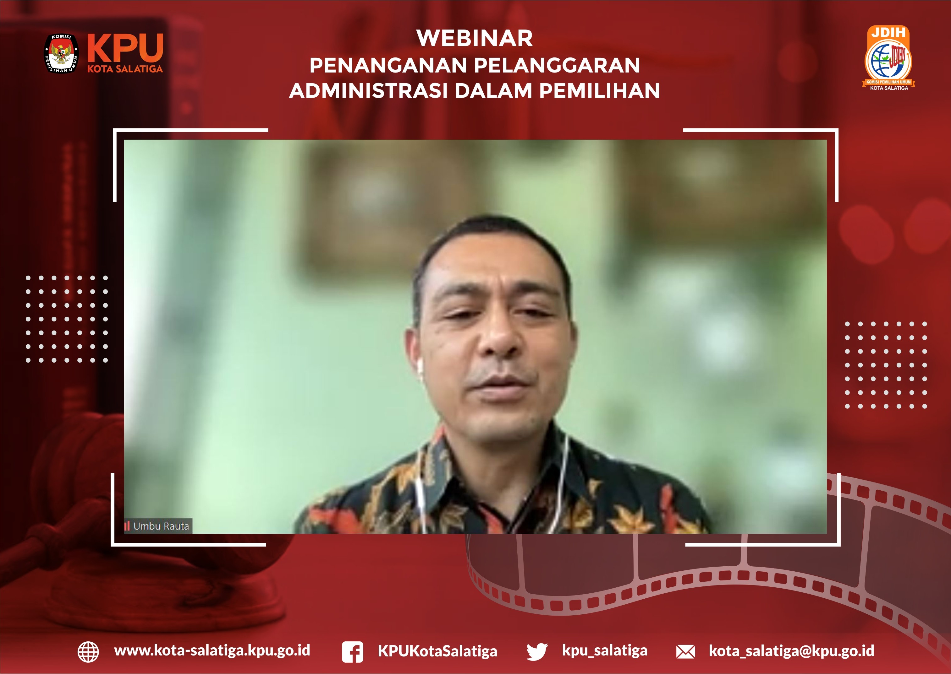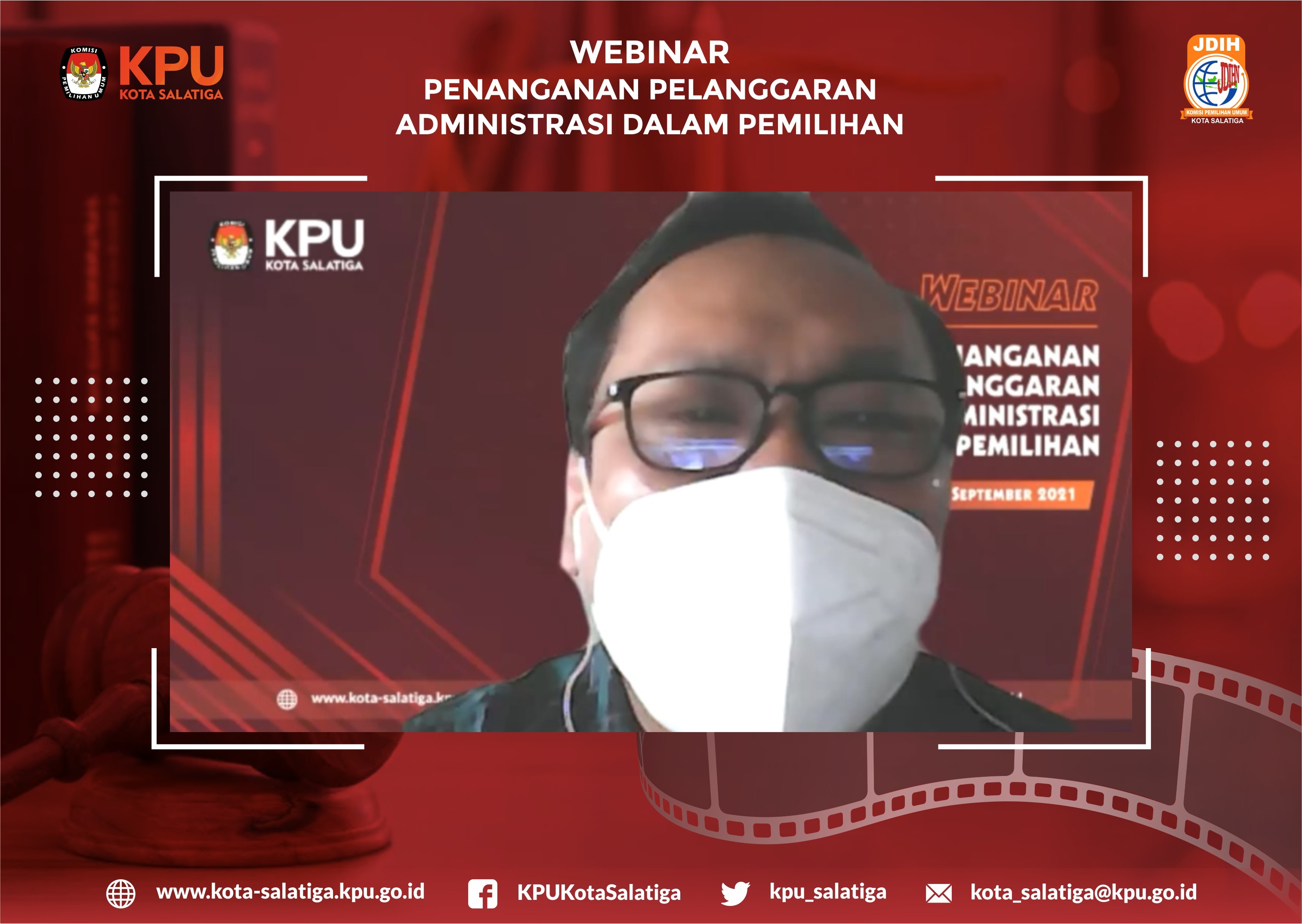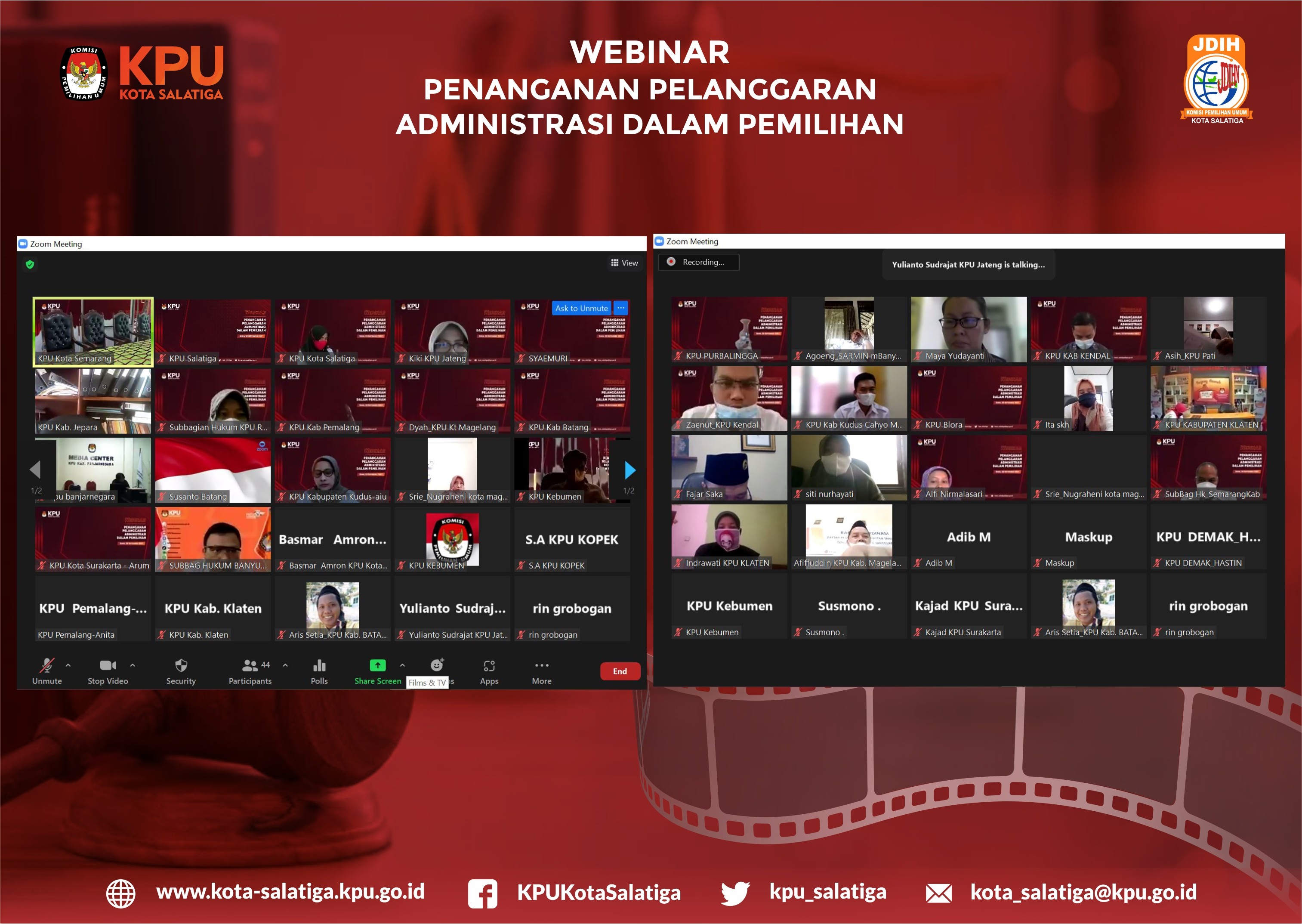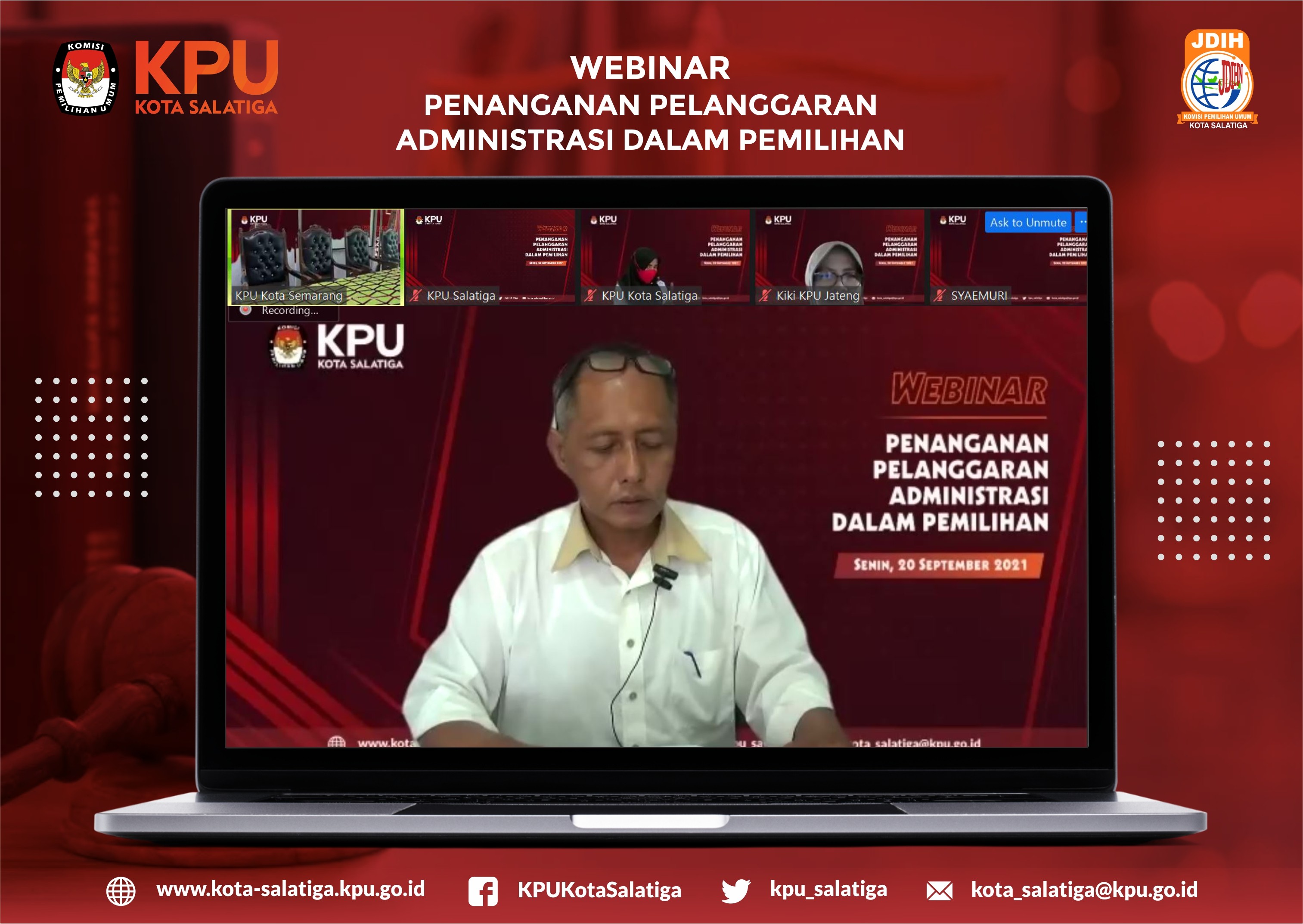 Senin, 20 September 2021 KPU Kota Salatiga menyelenggarakan Webinar bertajuk “Penanganan Pelanggaran Administrasi Pemilihan”. Bekerjsama dengan KPU Provinsi Jawa Tengah, mengundang Divisi Hukum dan Pengawasan KPU Provinsi Jawa Tengah, Muslim Aisha, S.HI, Ketua Bawaslu Provinsi Jawa Tengah, Fajar Subhi A.K. Arif, SH., MH dan Direktur Pusat Studi Hukum dan Teori Konstitusi UKSW, Dr. Umbu Rauta, S.H,M.Hum sebagai narasumber. Webinar dimoderatori oleh Ketua KPU Kota Salatiga, Syaemuri, S.Ag. dan dihadiri oleh Ketua, Divisi Hukum dan Pengawasan serta Kasubbag Hukum KPU Kabupaten/Kota se-Jawa Tengah.