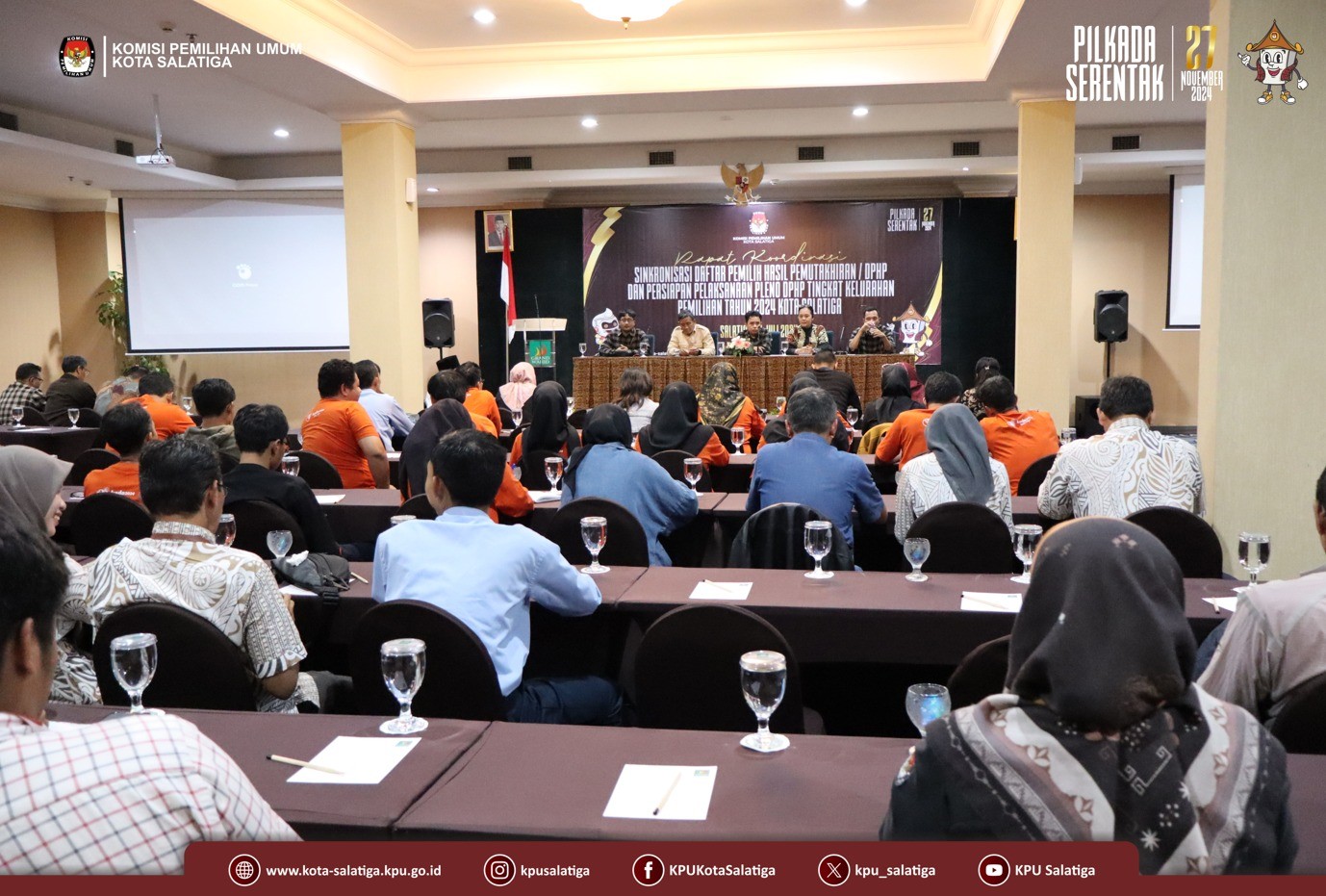 Kota-salatiga.kpu.go.id - Rabu (31/7) bertempat di Hotel Grand Wahid Salatiga, KPU Kota Salatiga adakan kegiatan Rapat Koordinasi Sinkronisasi Daftar Pemilih Hasil Pemutakhiran DPHP. Tujuan diselenggarakannya acara ini untuk persiapan bagi PPS melaksanakan Rapat Pleno terbuka tingkat kelurahan di Kota Salatiga. KPU Salatiga menyampaikan bahwa Pleno akan diadakan secara serentak di tingkat kelurahan pada hari Jumat, tanggal 2 Agustus 2024. Acara ini dihadiri oleh Kesbangpol Salatiga, Dindukcapil Salatiga, Rutan Salatiga, Bawaslu Salatiga serta rekan-rekan PPK dan PPS se-Kota Salatiga.