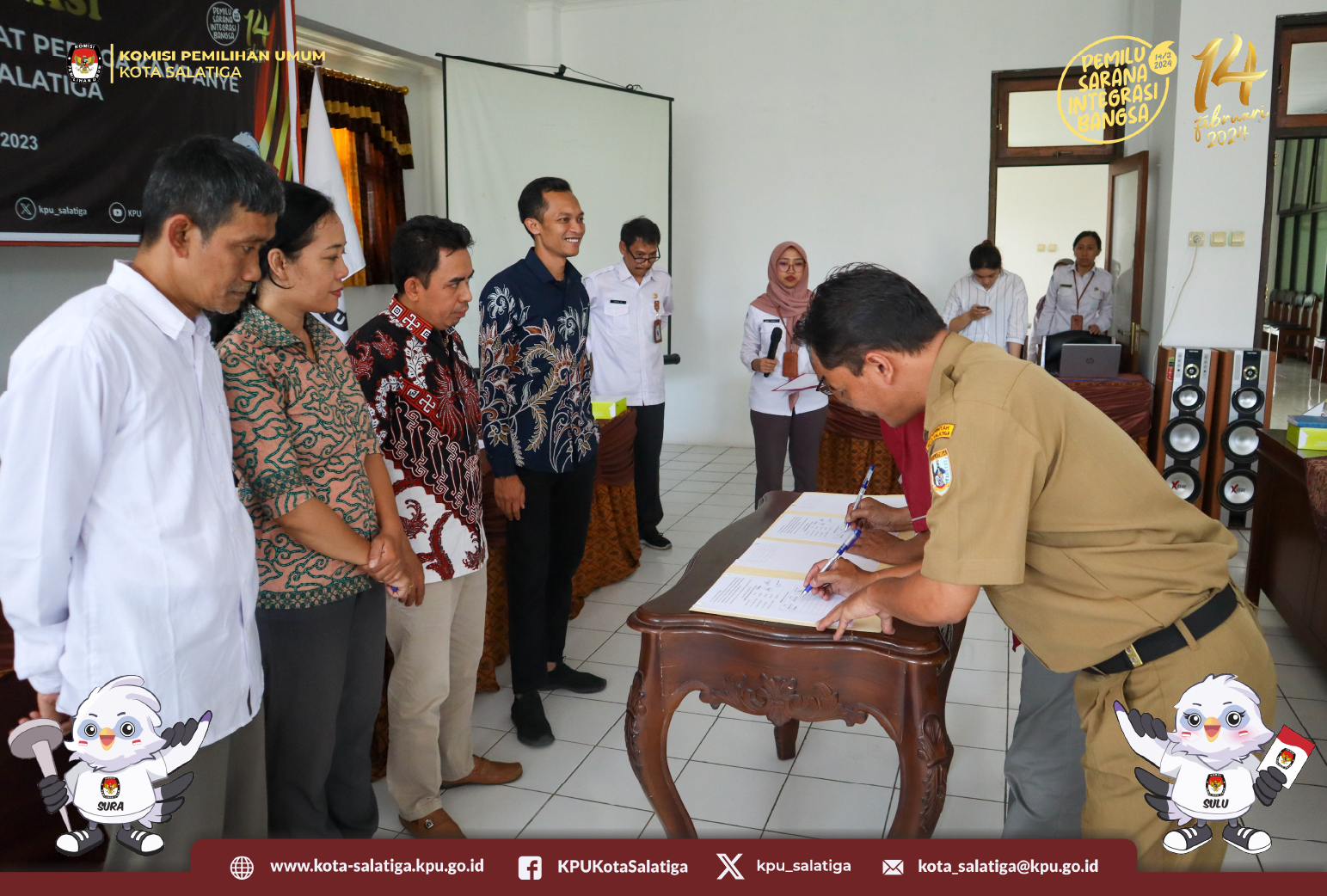 kota-salatiga.kpu.go.id - Senin (20/11) KPU Kota Salatiga mengadakan Rapat Koordinasi Lokasi Pemasangan Alat Peraga Kampanye Pemilu 2024 di Kota Salatiga bersama dengan Bawaslu dan Instansi terkait. Rakor tersebut dilaksanakan di Aula Kantor KPU Kota Salatiga. Ketua KPU Kota Salatiga, Yesaya Tiluata menyampaikan bahwa Rakor ini perlu dilakukan untuk menyamakan persepsi dan mencapai kesepakatan bersama terkait titik-titik lokasi pemasangan APK dalam Pemilu 2024. “Rakor ini penting agar pemasangan alat peraga kampanye dapat berjalan tertib, aman, dan lancar” ujarnya.