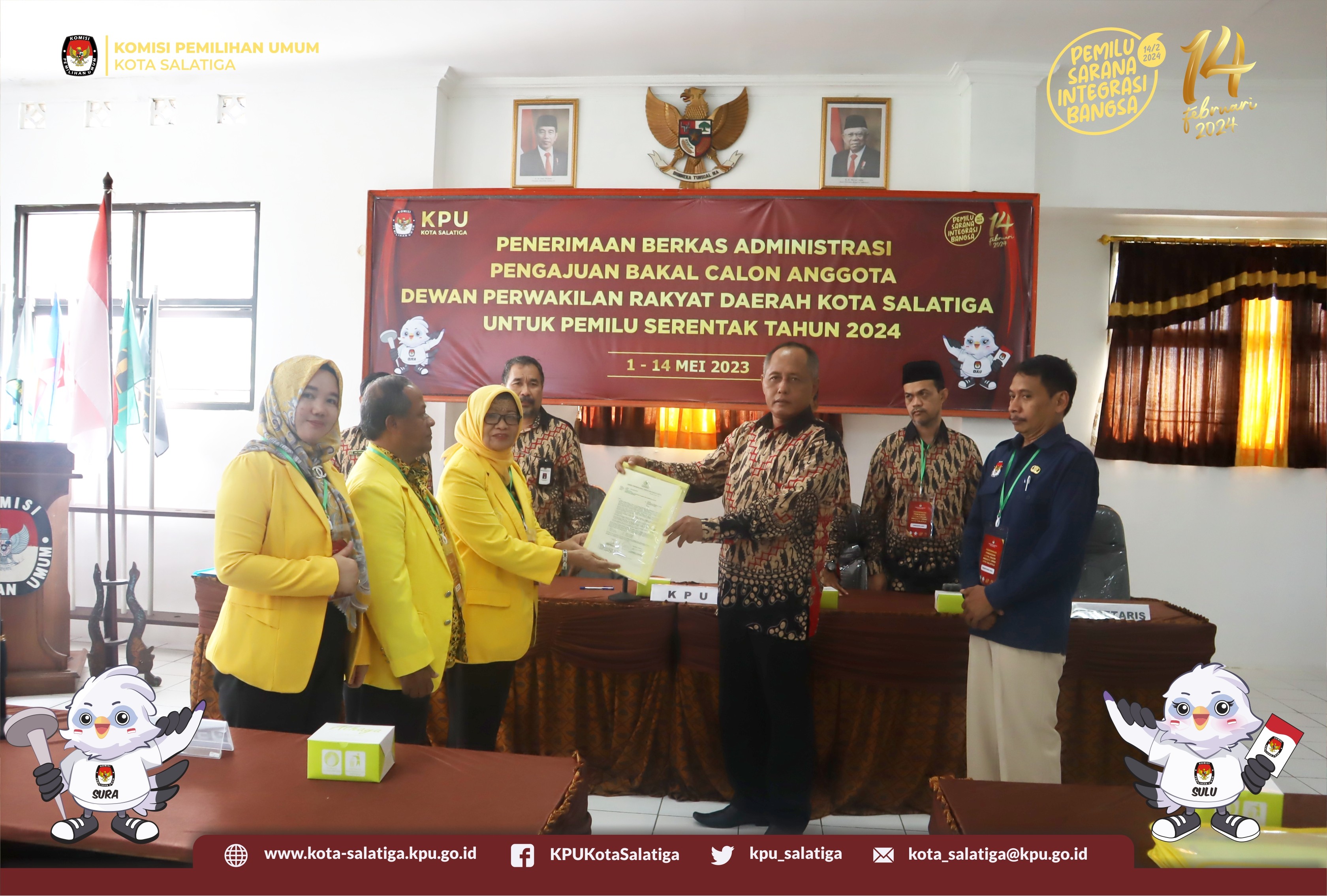 Pada pengajuan kali ini Golkar statusnya lengkap dan diterima. Baik dokumen fisik dan digital berupa form B-Pengajuan Partai Politik dan Form B-Daftar Calon serta dokumen secara digital syarat calon semua ada/lengkap dan diterima. Dari 25 Kursi di Salatiga, Golkar mengajukan 100 % Bacaleg di 4 dapil di Salatiga, serta memenuhi minimal 30%, yaitu 11 orang atau 44% bacaleg perempuanya.
