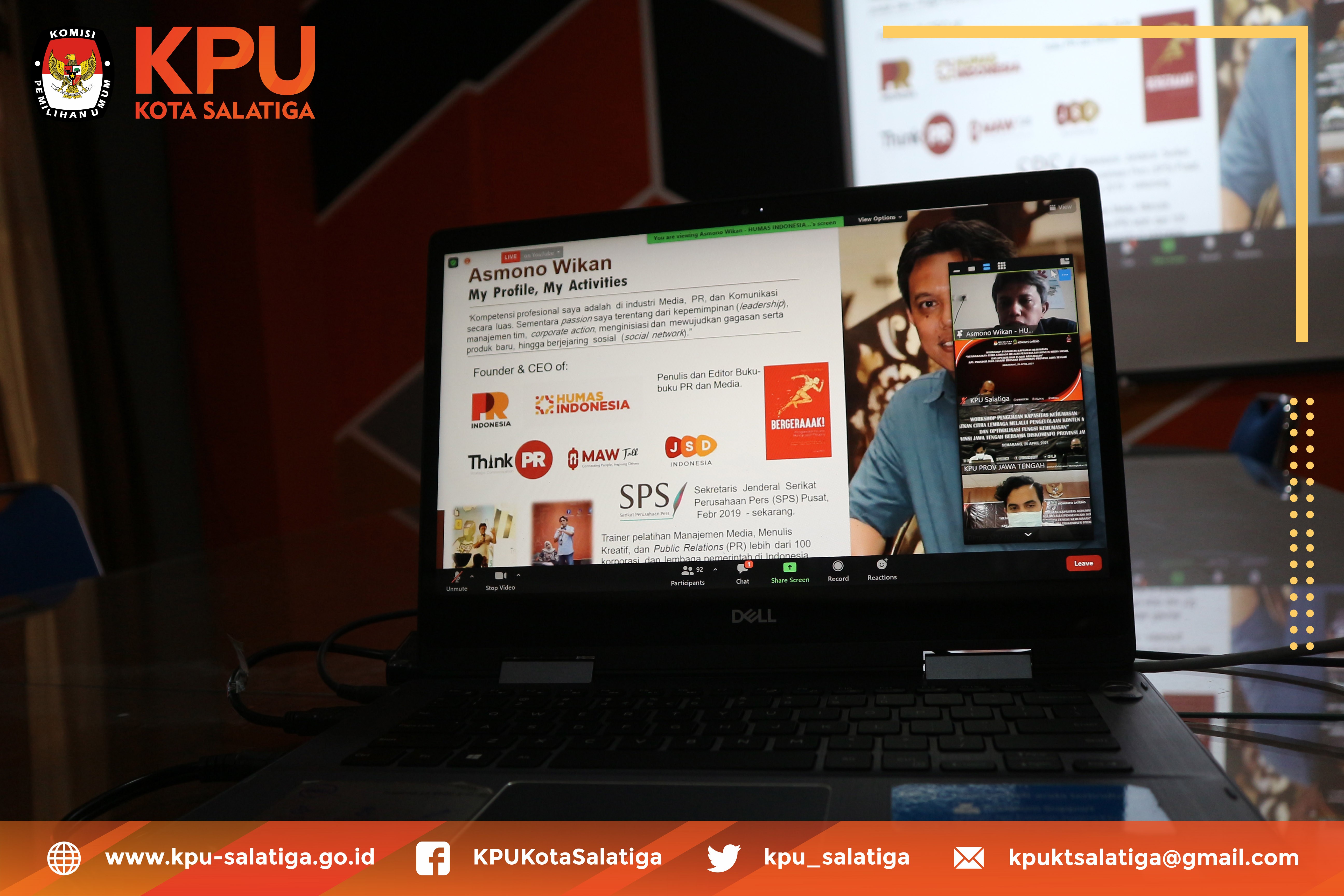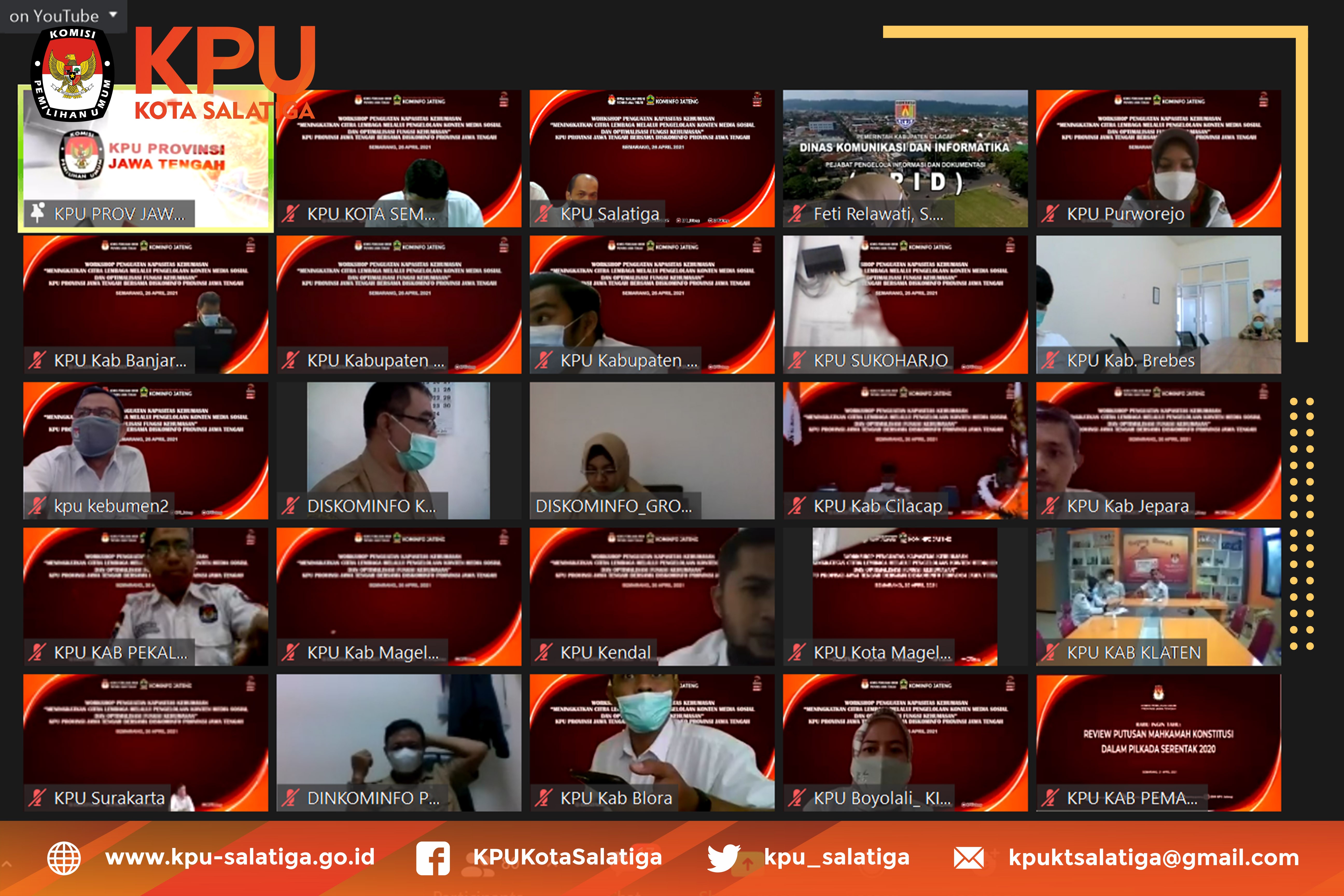 Senin (26/4), bertempat di Ruang Rumah Pintar Pemilu (RPP) KPU Kota Salatiga, Anggota Divisi Sosdiklih Parmas beserta staf bagian Teknis Hupmas mengikuti online workshop penguatan kapasitas kehumasan dengan tema “Meningkatkan Citra Lembaga Melalui Pengelolaan Konten Media Sosial dan Optimalisasi Fungsi Kehumasan”. Kegiatan ini merupakan kerjasama KPU Provinsi Jawa Tengah dengan Dinas Komunikasi dan Informatika Jawa Tengah. Selain KPU Kabupaten /Kota se –Jawa Tengah, kegiatan ini juga diikuti oleh Dinas Kominfo Se-Jawa Tengah.