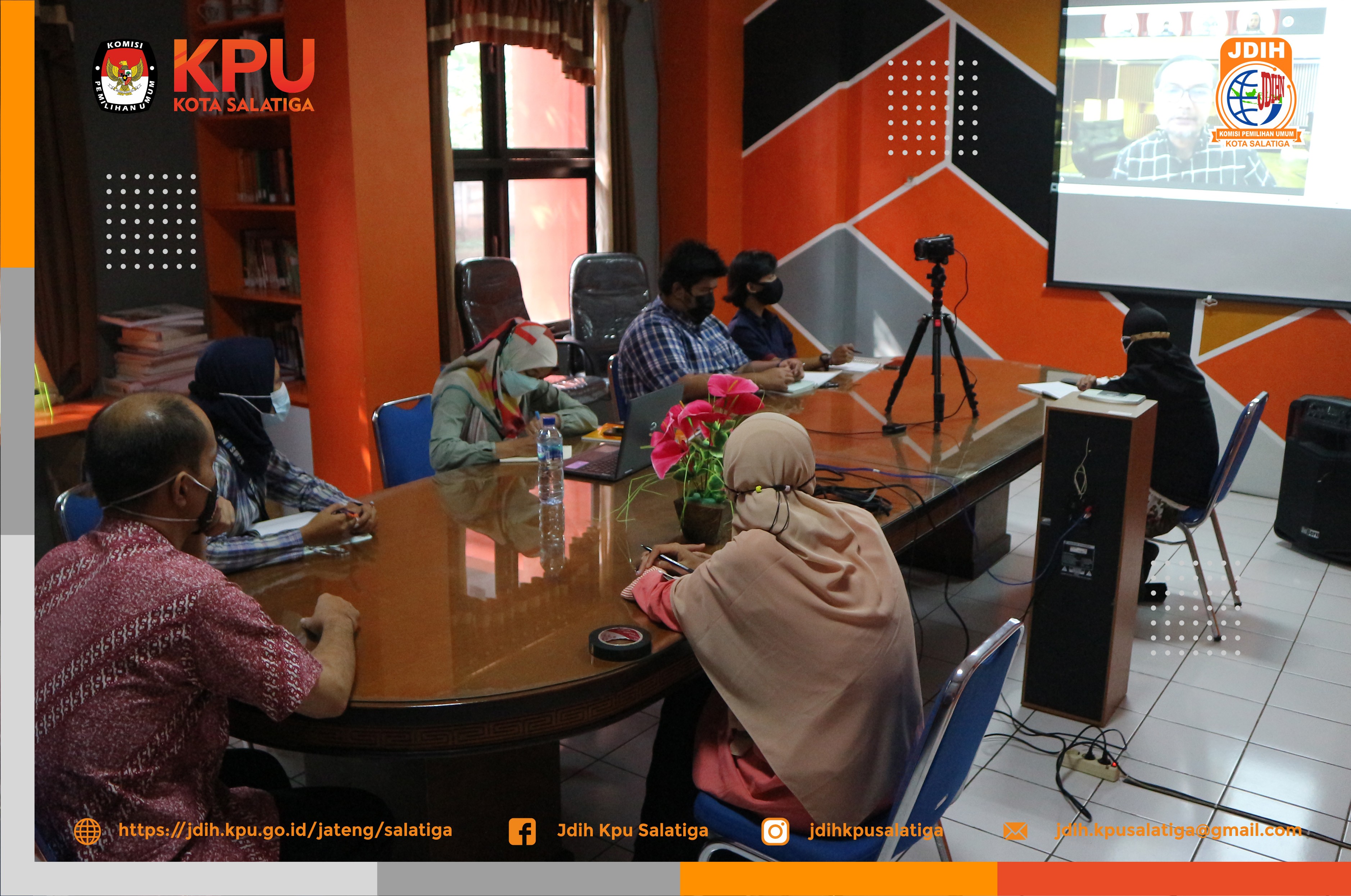 Salatiga, 9 Juli 2021, dalam rangka evaluasi pengelolaan Jaringan Dokumentasi dan Informasi Hukum (JDIH) di KPU Kota Salatiga, Anggota KPU Divisi Hukum, kasubbag dan staf mengikuti rapat koordinasi. Kegiatan diselenggarakan oleh KPU Provinsi Jawa Tengah yang diikuti oleh 35 KPU Kabupaten/Kota se Jawa Tengah secara daring.