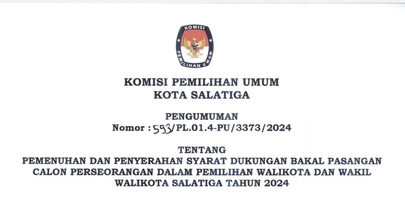 Berdasarkan Undang Undang Nomor 10 Tahun 2016 tentang perubahan kedua atas Undang undang Nomor 1 Tahun 2015 tentang Penetapan Peraturan Pemerintah Pengganti Undang-Undang Nomor 1 Tahun 2014 Tentang Pemilihan Gubernur , Bupati, dan Walikota menjadi Undang-Undang, Keputusan Peraturan Komisi Pemilihan Umum Nomor 2 Tahun 2024 tentang Tahapan dan Jadwal Pemilihan Gubernur dan Wakil Gubernur, Bupati dan Wakil Bupati, serta Walikota dan Wakil Walikota Tahun 2024, dan Keputusan Komisi Pemilihan Umum Provinsi Jawa Tengah Nomor 47 Tahun 2024 sebagaimana diubah terakhir Nomor 52.1 Tahun 2024 tentang Syarat Minimal dan Persebaran Dukungan Bakal Calon Perseorangan Dalam Pemilihan Walikota dan Wakil Walikota Salatiga Tahun 2024, dengan ini diumumkan kepada seluruh masyarakat yang akan mencalonkan diri dalam Walikota dan Wakil Walikota Salatiga Tahun 2024 melalui jalur perseorangan untuk dapat melengkapi dan menyerahkan dokumen dukungan persyaratan dengan ketentuan sebagai berikut :