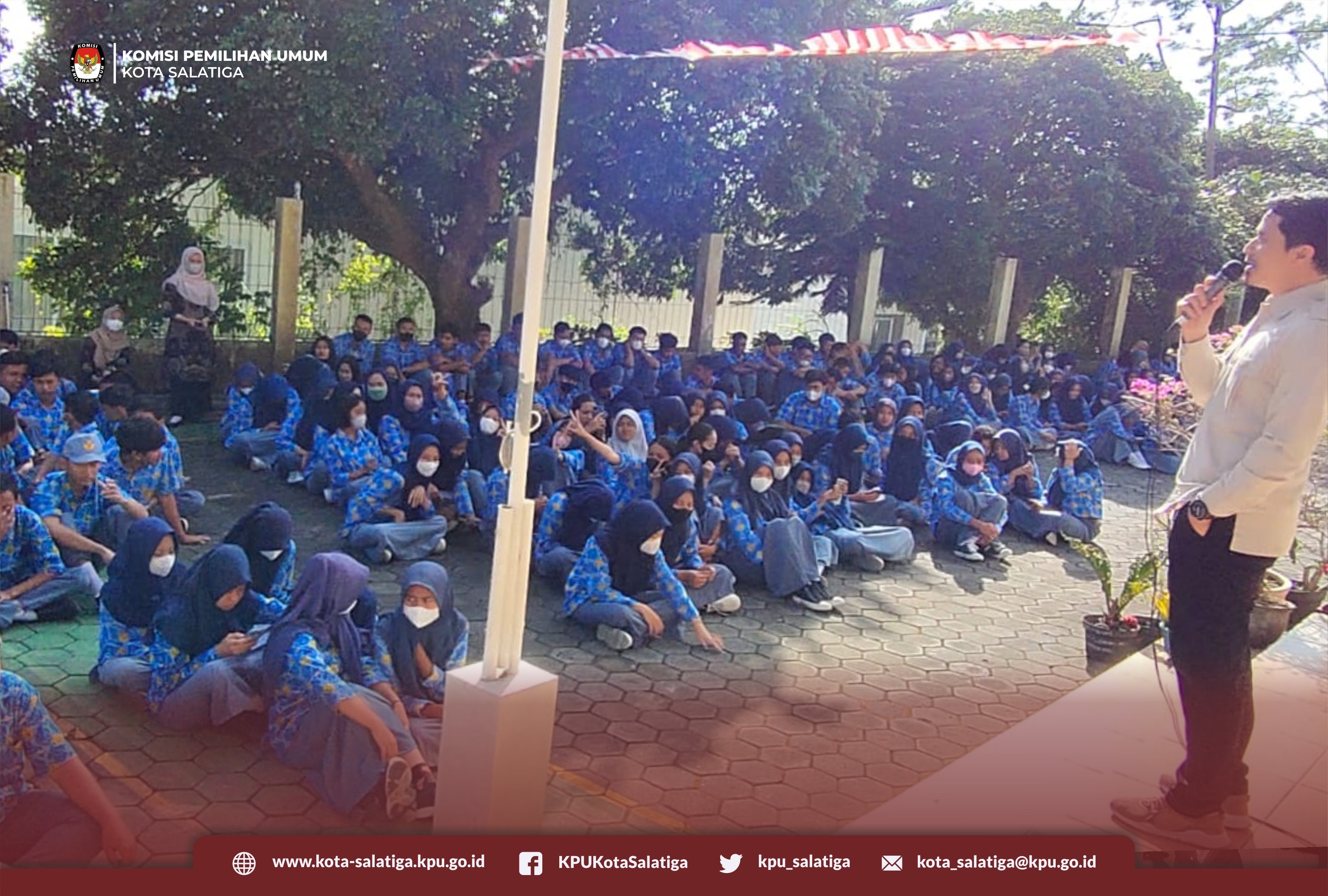 kota-salatiga.kpu.go.id- KPU Kota Salatiga melaksanakan kegiatan Sosialisasi dan Pendidikan Pemilih Pemula di SMK Bhakti Nusantara Salatiga. Kegiatan diikuti oleh seluruh siswa-siswi semua kelas dan seluruh guru. Semua berkumpul di halaman sekolah mendengarkan materi dari komiisioner KPU Kota Salatiga Divisi sosialisasi pendidikan pemilih, partisipasi Masyarakat dan SDM Abdul Rochim,(18/8/2022).
