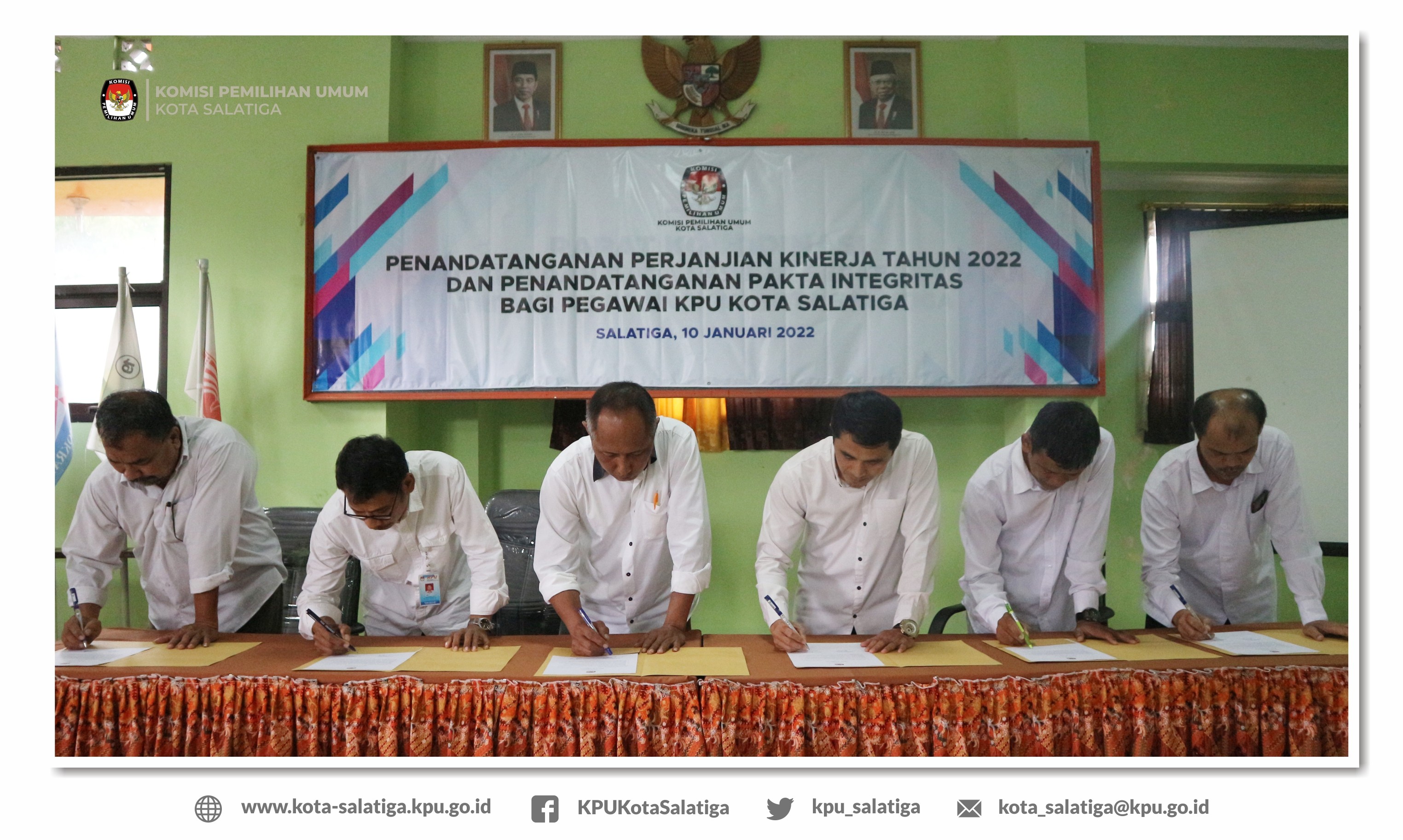 kota-salatiga.kpu.go.id Mengawali kerja kelembagaan tahun ini, KPU Kota Salatiga telah menyusun Perjanjian Kinerja Tahun 2022. Bertempat di ruang aula, Senin (10/01), dilaksanakan penadatanganan Perjanjian Kinerja oleh Ketua dan Sekretaris. Kegiatan dihadiri oleh seluruh komisioner dan pegawai di lingkungan KPU Kota Salatiga. Pada kesempatan ini, berlangsung pula penandatanganan Pakta Integritas oleh seluruh anggota Komisioner dan komponen PNS.