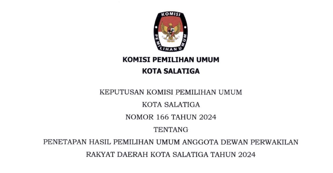 Bahwa dalam rangka melaksanakan ketentuan Pasal 57 Peraturan KPU Nomor 5 Tahun 2024 tentang Rekapitulasi Hasil Penghitungan Perolehan Suara dan Penetapan Hasil Pemilihan Umum. KPU Kota Salatiga mengumumkan kepada seluruh masyarakat Kota Salatiga Keputusan Komisi Pemilihan Umum Kota Salatiga Nomor 166 Tahun 2024 tentang Penetapan Hasil Pemilihan Umum Anggota Dewan Perwakilan Rakyat Daerah Kota Salatiga Tahun 2024. Demikian untuk dapat diketahui oleh seluruh warga masyarakat Kota Salatiga.
