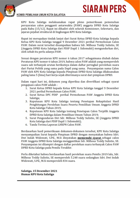 PENGGANTIAN ANTAR WAKTU (PAW) ANGGOTA DPRD KOTA SALATIGA