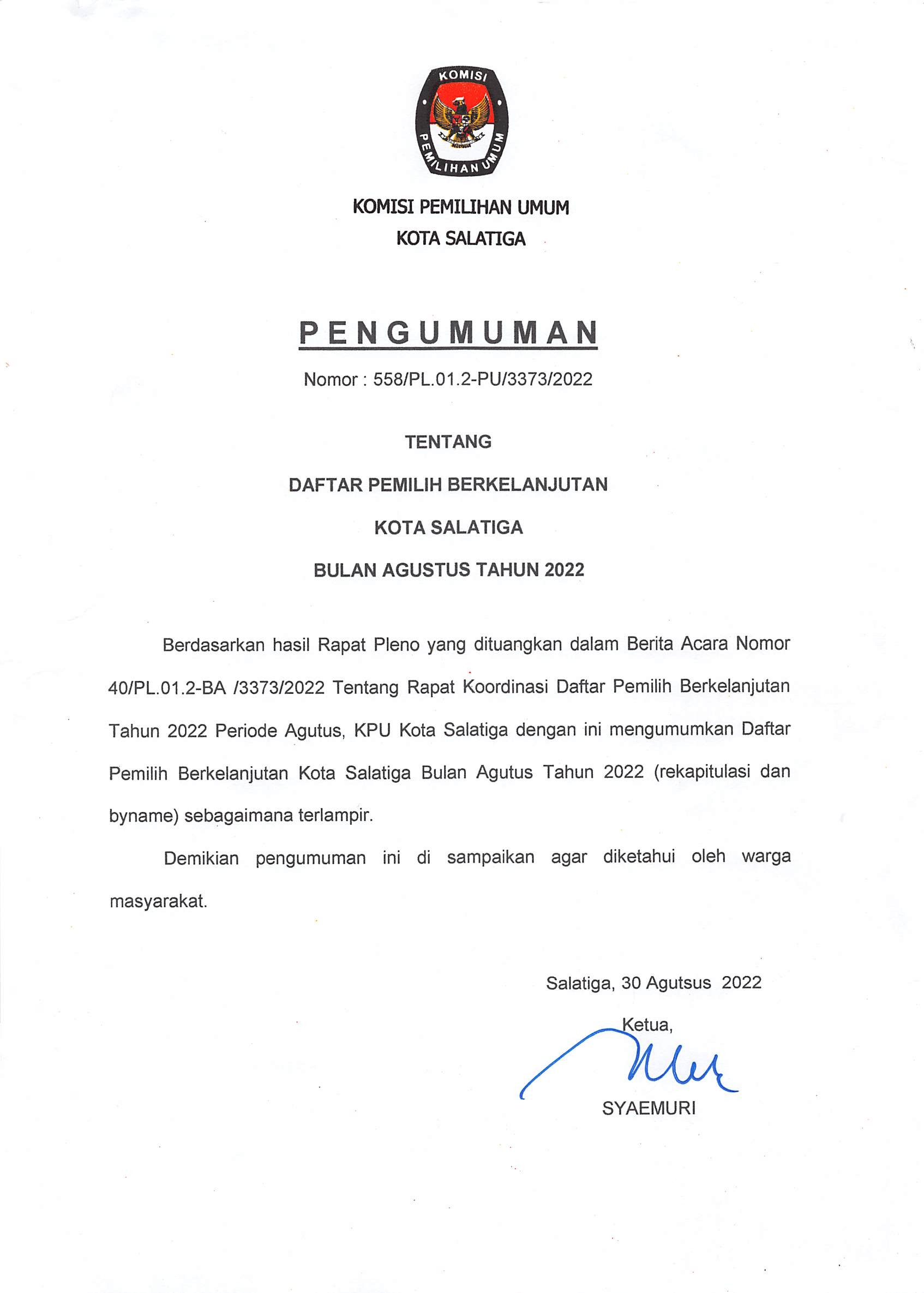 Berdasarkan hasil Rapat Koordinasi yang dituangkan dalam Berita Acara Nomor 40/PL.01.2/3373/2022 tentang Rapat Pleno Rekapitulasi Daftar Pemilih Berkelanjutan Tahun 2022, KPU Kota Salatiga dengan ini mengumumkan Daftar Pemilih Berkelanjutan Kota Salatiga Bulan Agustus Tahun 2022 (rekapitulasi dan byname) sebagaimana terlampir.