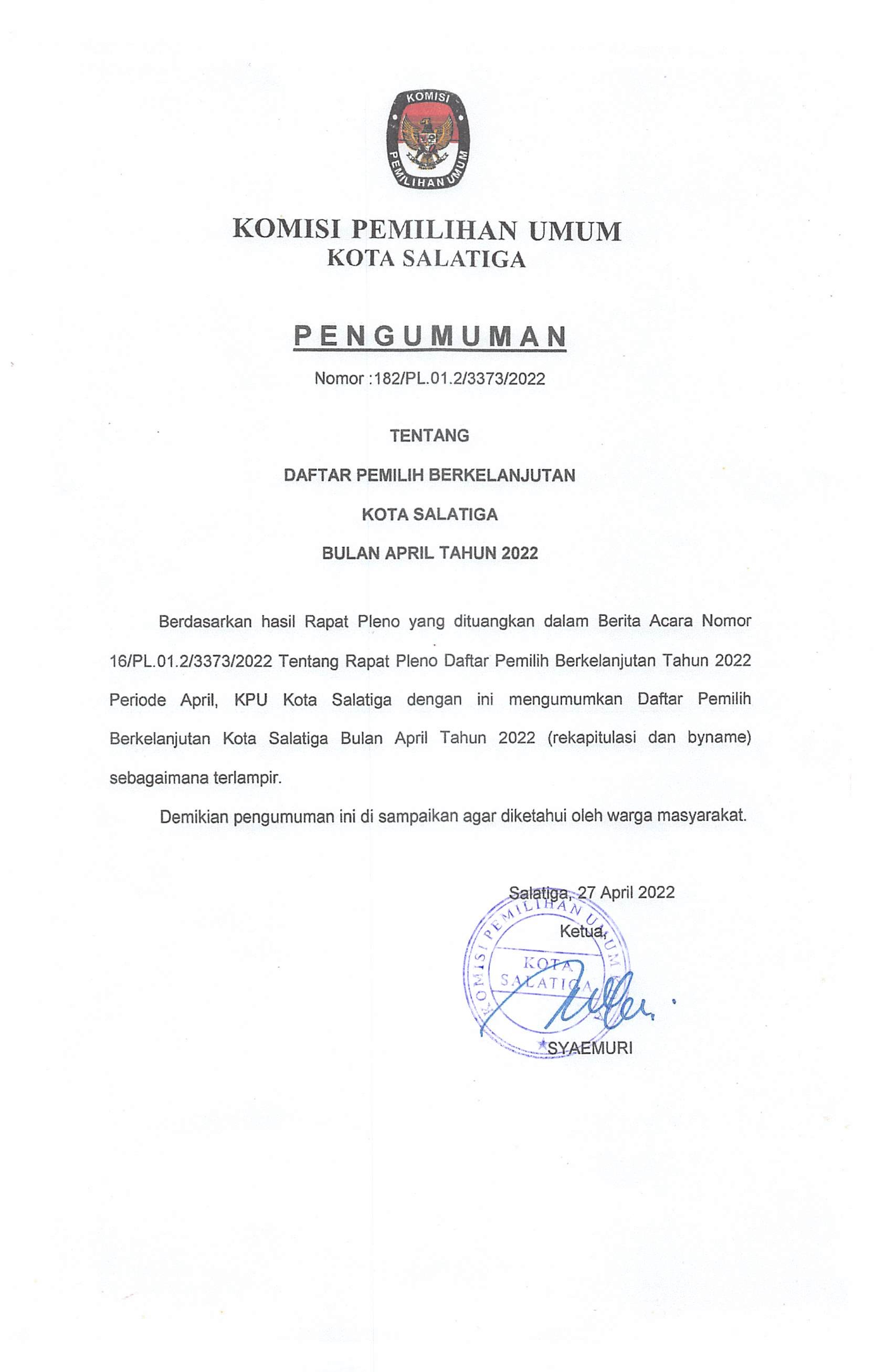 Berdasarkan hasil Rapat Koordinasi yang dituangkan dalam Berita Acara Nomor 16/PL.01.2/3373/2022 tentang Rapat Pleno Rekapitulasi Daftar Pemilih Berkelanjutan Tahun 2022, KPU Kota Salatiga dengan ini mengumumkan Daftar Pemilih Berkelanjutan Kota Salatiga Bulan April Tahun 2022 (rekapitulasi dan byname) sebagaimana terlampir.
