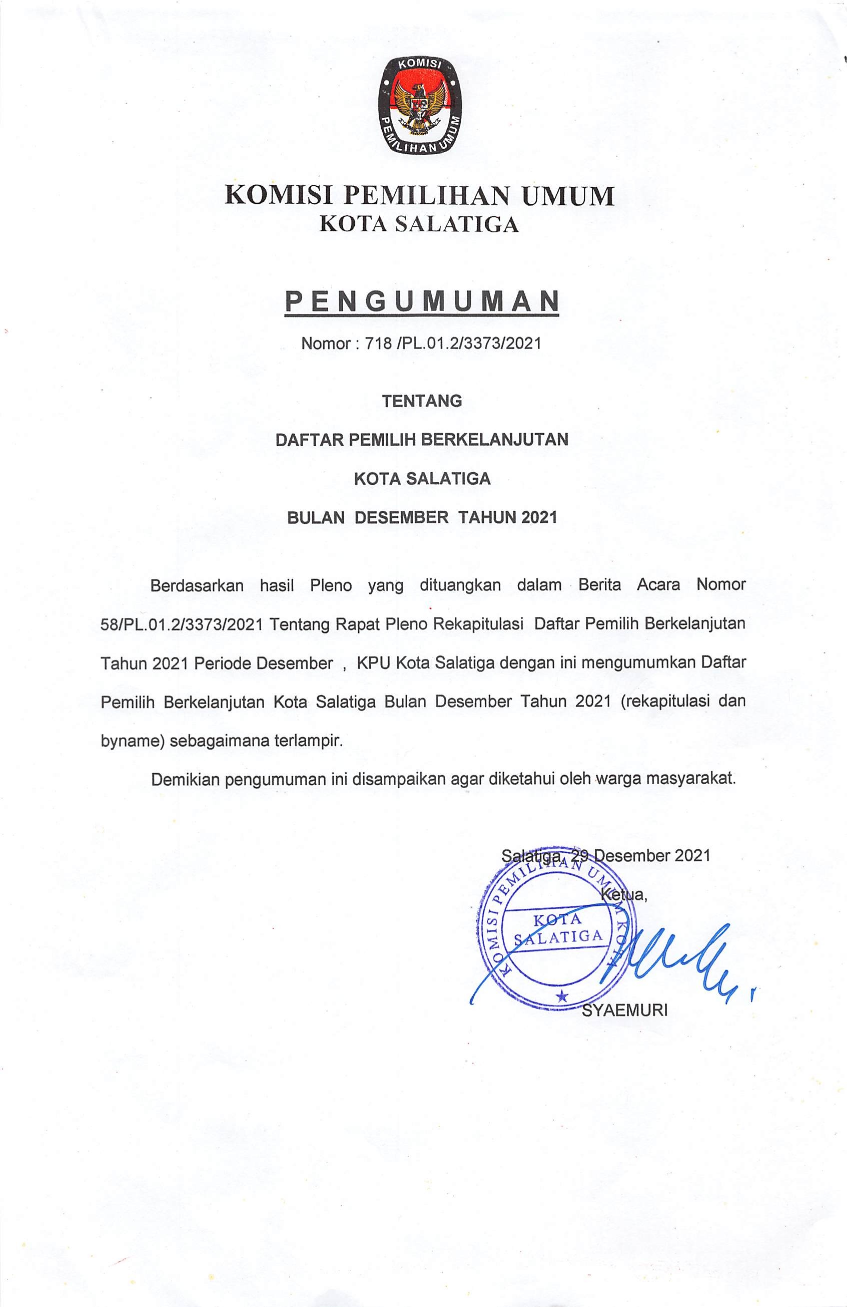 PENGUMUMAN DAFTAR PEMILIH BERKELANJUTAN (DPB) KOTA SALATIGA BULAN DESEMBER 2021