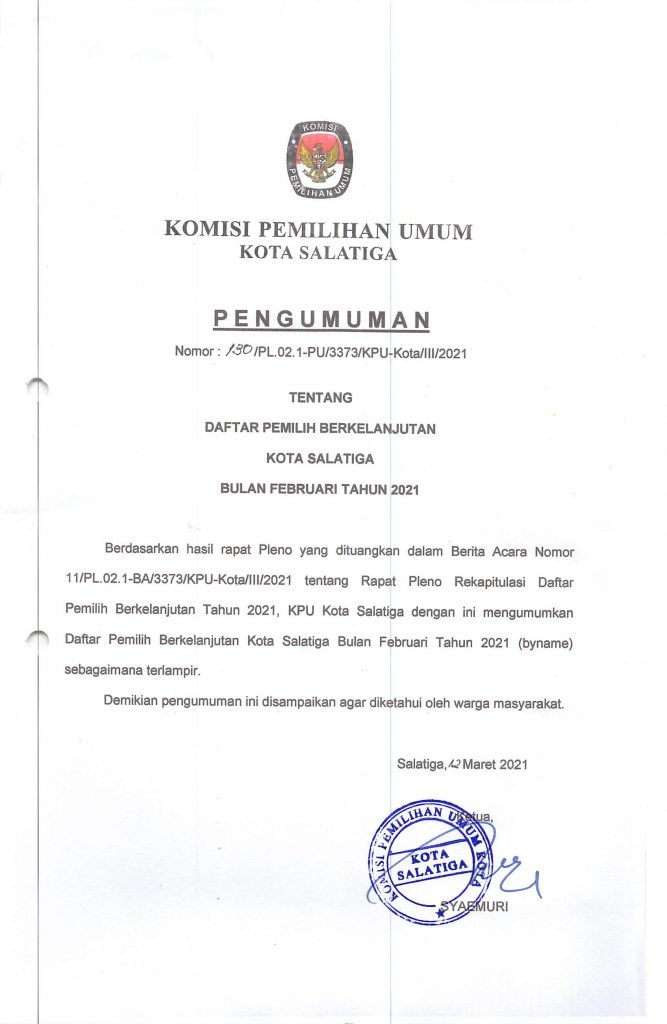 Berdasarkan hasil Rapat Koordinasi yang dituangkan dalam Berita Acara Nomor 11/PL.02.1-BA/3373/KPU-Kota/IiI/2021 tentang Rapat Pleno Rekapitulasi Daftar Pemilih Berkelanjutan Tahun 2021, KPU Kota Salatiga dengan ini mengumumkan Daftar Pemilih Berkelanjutan Kota Salatiga Bulan Februari Tahun 2021 sebagaimana terlampir