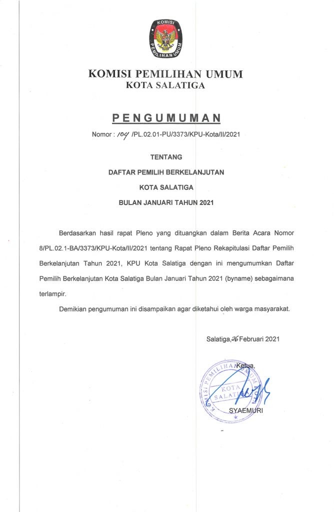 Berdasarkan hasil Rapat Koordinasi yang dituangkan dalam Berita Acara Nomor 8/PL.02.1-BA/3373/KPU-Kota/II/2021 tentang Rapat Pleno Rekapitulasi Daftar Pemilih Berkelanjutan Tahun 2021, KPU Kota Salatiga dengan ini mengumumkan Daftar Pemilih Berkelanjutan Kota Salatiga Bulan Januari Tahun 2021 sebagaimana terlampir