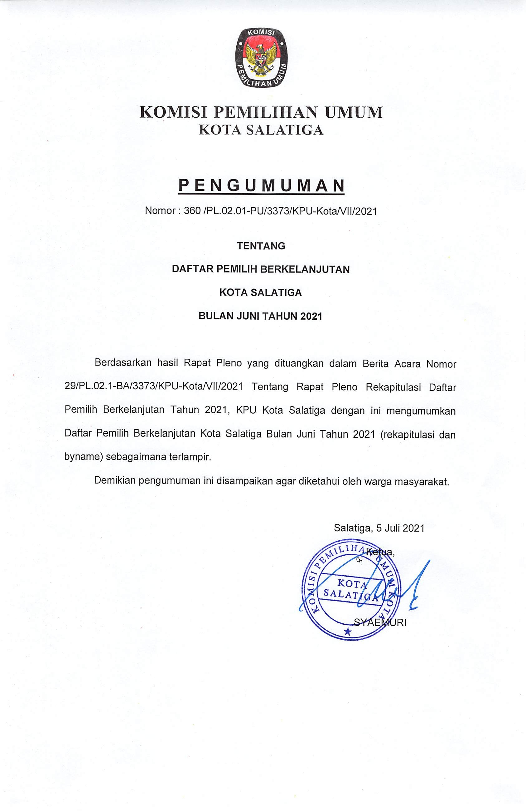 Berdasarkan hasil Rapat Koordinasi yang dituangkan dalam Berita Acara Nomor 29/PL.02.1-BA/3373/KPU-Kota/VII/2021 tentang Rapat Pleno Daftar Pemilih Berkelanjutan Tahun 2021, KPU Kota Salatiga dengan ini mengumumkan Daftar Pemilih Berkelanjutan Kota Salatiga Bulan Juni Tahun 2021 (rekapitulasi dan byname) sebagaimana terlampir.
