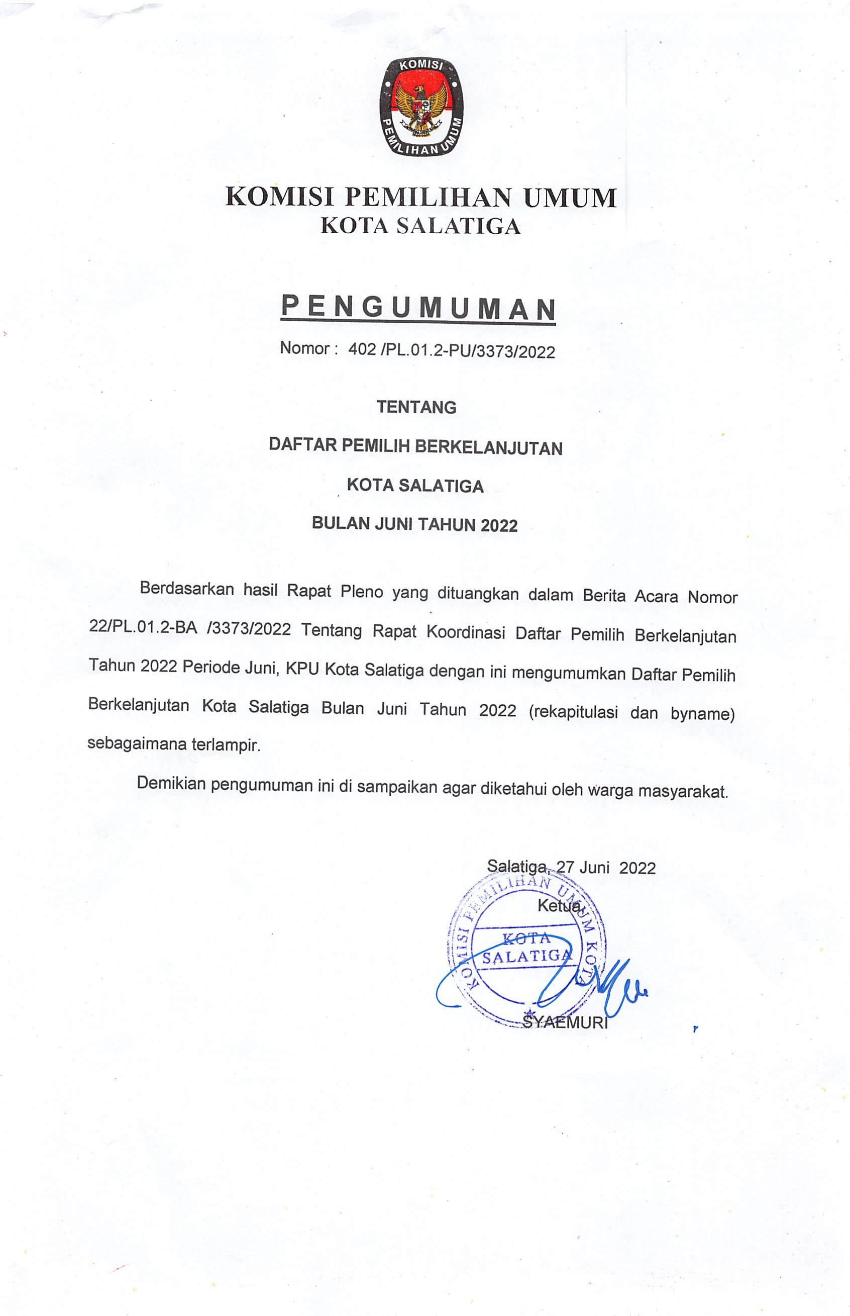 Berdasarkan hasil Rapat Koordinasi yang dituangkan dalam Berita Acara Nomor 22/PL.01.2/3373/2022 tentang Rapat Pleno Rekapitulasi Daftar Pemilih Berkelanjutan Tahun 2022, KPU Kota Salatiga dengan ini mengumumkan Daftar Pemilih Berkelanjutan Kota Salatiga Bulan Juni Tahun 2022 (rekapitulasi dan byname) sebagaimana terlampir.