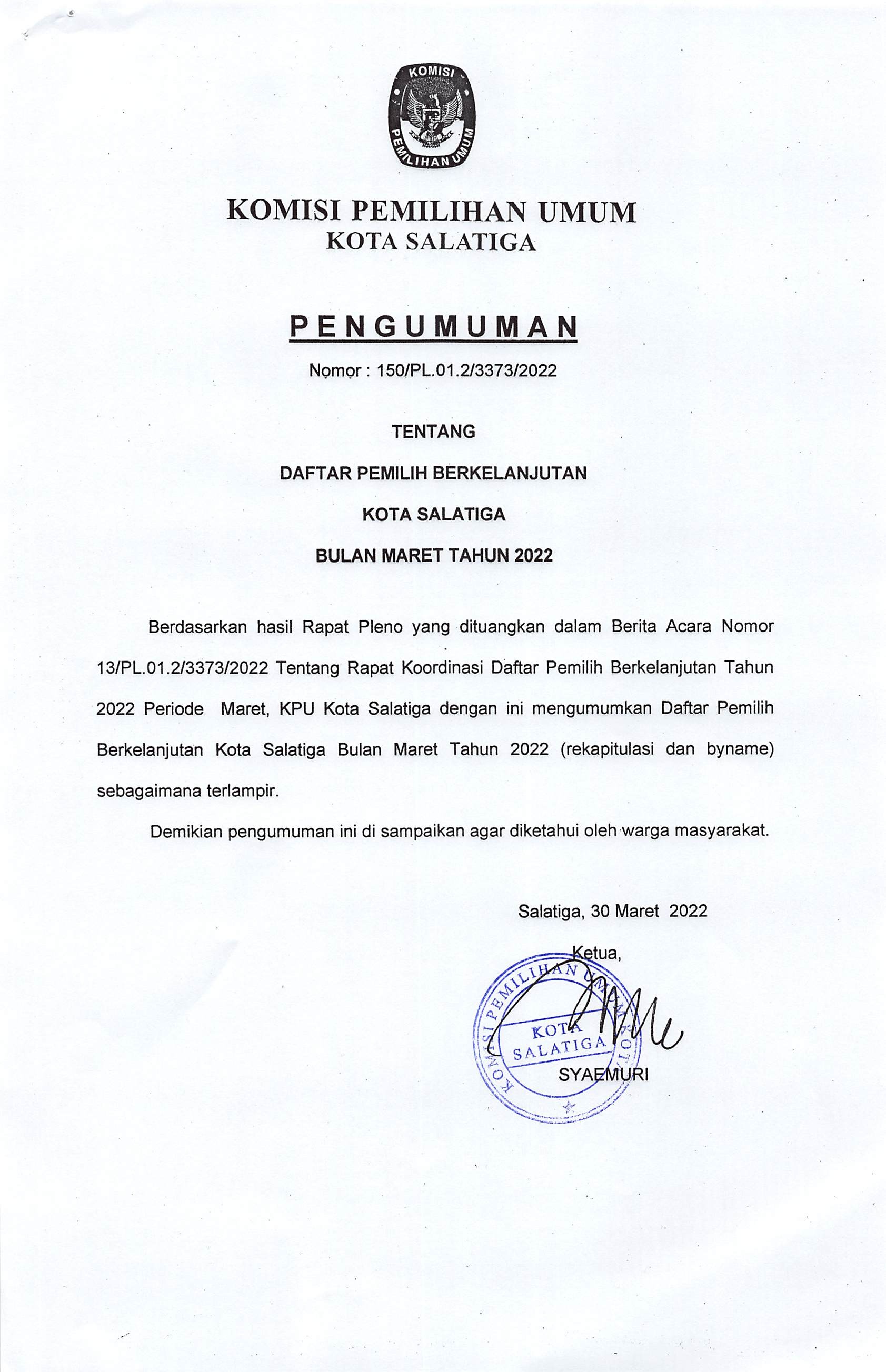 PENGUMUMAN DAFTAR PEMILIH BERKELANJUTAN (DPB) KOTA SALATIGA BULAN MARET 2022