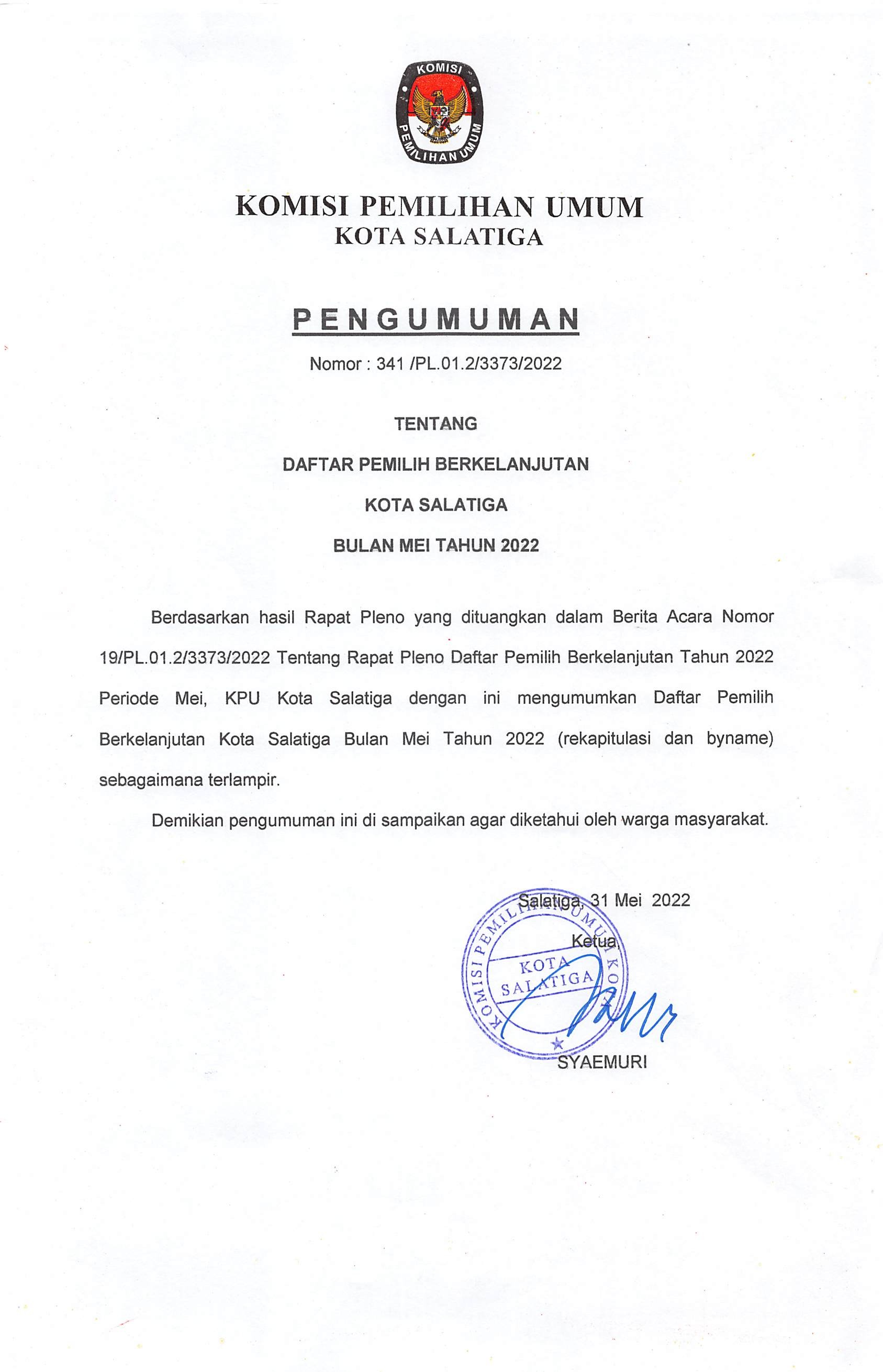 Berdasarkan hasil Rapat Koordinasi yang dituangkan dalam Berita Acara Nomor 19/PL.01.2/3373/2022 tentang Rapat Pleno Rekapitulasi Daftar Pemilih Berkelanjutan Tahun 2022, KPU Kota Salatiga dengan ini mengumumkan Daftar Pemilih Berkelanjutan Kota Salatiga Bulan mEI Tahun 2022 (rekapitulasi dan byname) sebagaimana terlampir.