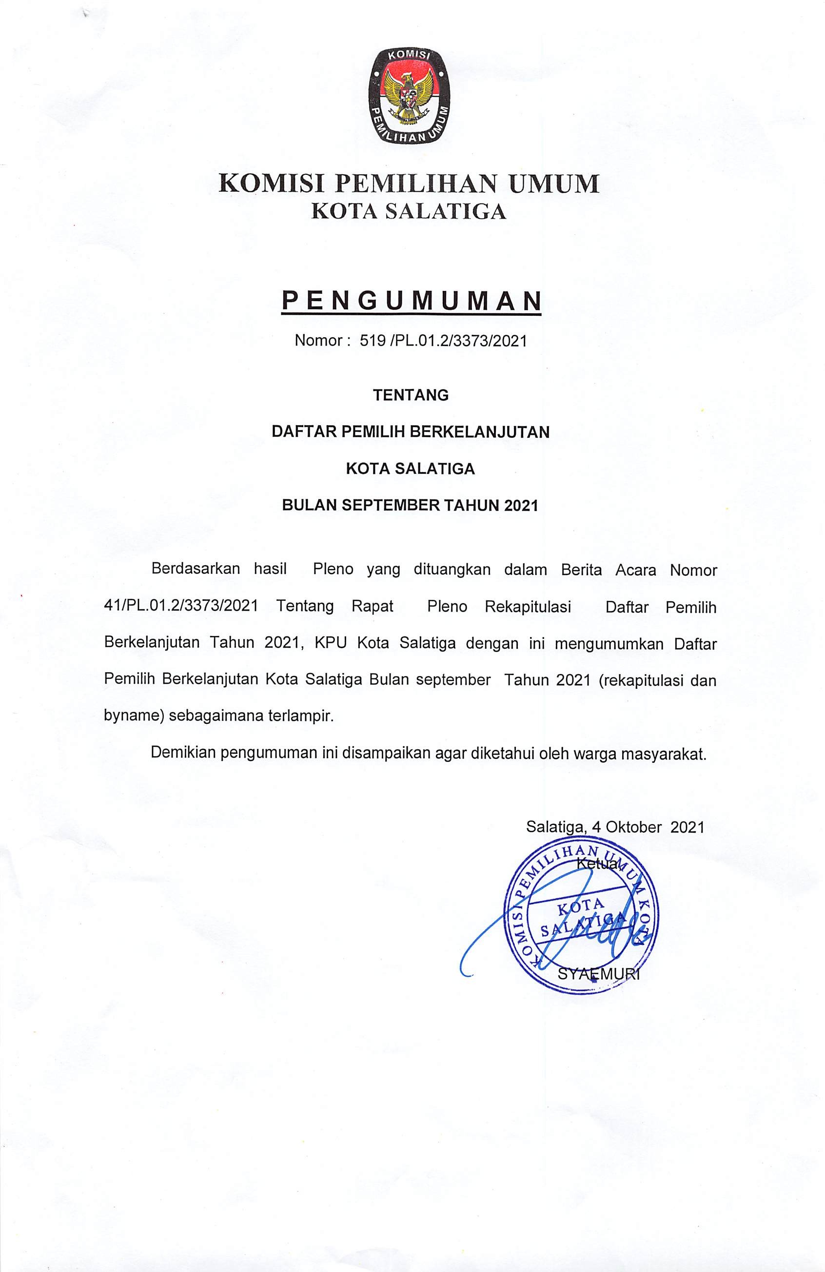 PENGUMUMAN DAFTAR PEMILIH BERKELANJUTAN (DPB) KOTA SALATIGA BULAN SEPTEMBER 2021