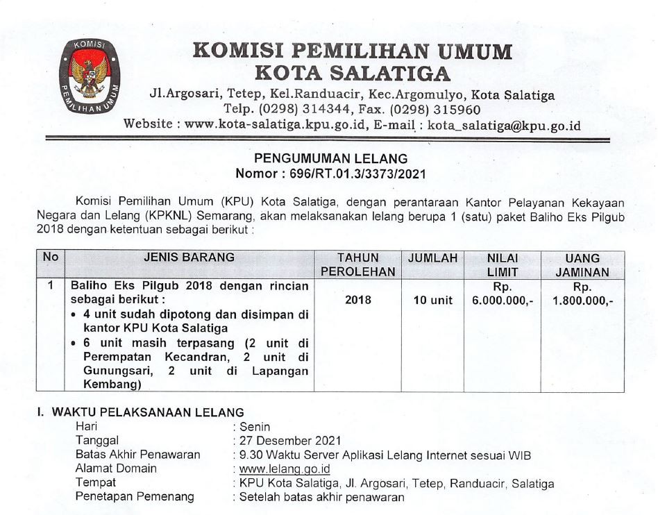 Komisi Pemilihan Umum (KPU) Kota Salatiga, dengan perantaraan Kantor Pelayanan Kekayaan Negara dan Lelang (KPKNL) Semarang, akan melaksanakan lelang berupa 1 (satu) paket Baliho Eks Pilgub 2018 dengan ketentuan sebagai berikut :
