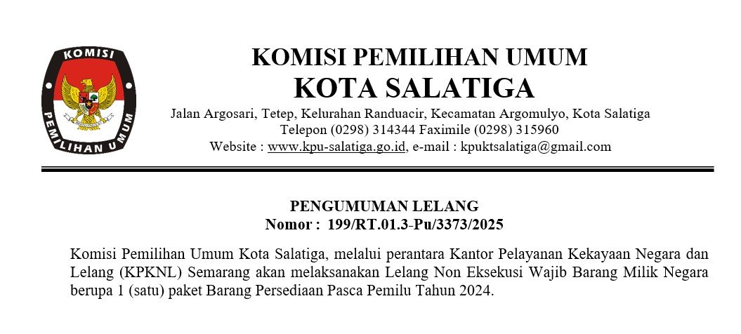 Pengumuman Nomor : 199/RT.01.3-Pu/3373/2025 Tentang Lelang Barang Milik Negara Barang Persediaan Pasca Pemilu 2024 Pada KPU Kota Salatiga