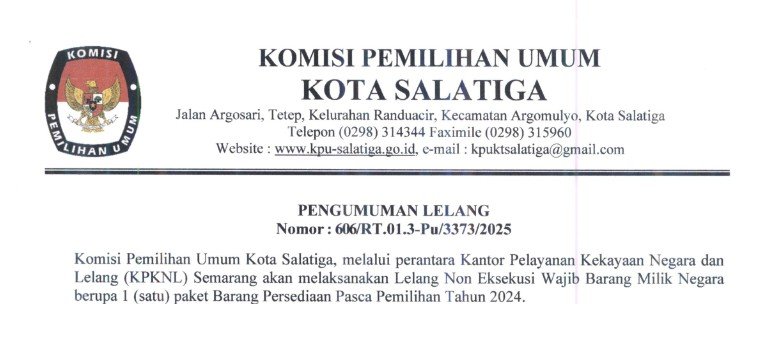 Pengumuman Nomor : 606/RT.01.3-Pu/3373/2025 Tentang Lelang Barang Milik Negara Barang Persediaan Pasca Pemilihan Tahun 2024 Pada KPU Kota Salatiga