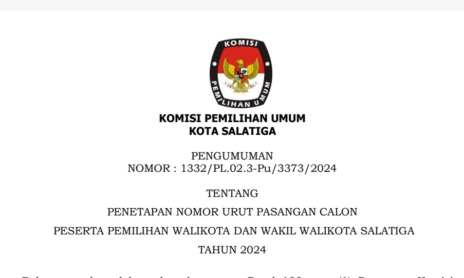Bahwa untuk melaksanakan ketentuan Pasal 122 ayat (1) Peraturan Komisi Pemilihan Umum Nomor 8 Tahun 2024 tentang Pencalonan Gubernur dan Wakil Gubernur, Bupati dan Wakil Bupati, serta Walikota dan Wakil Walikota sebagaimana telah diubah dengan Peraturan Komisi Pemilihan Umum Nomor 10 Tahun 2024 tentang Perubahan atas Peraturan Komisi Pemilihan Umum Nomor 8 Tahun 2024 tentang Pencalonan Gubernur dan Wakil Gubernur, Walikota dan Wakil Walikota, serta Walikota dan Wakil Walikota, KPU Kota Salatiga mengumumkan hasil Penetapan Nomor Urut Pasangan Calon Peserta Pemilihan Walikota dan Wakil Walikota Salatiga Tahun 2024 sebagai berikut.. Klik DISINI