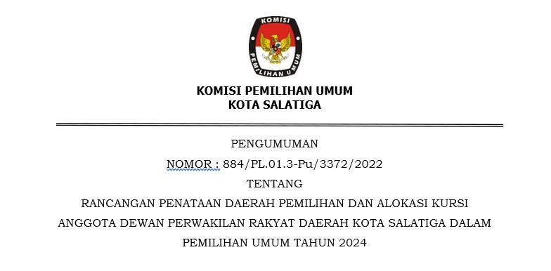 PENGUMUMAN RANCANGAN PENATAAN DAERAH PEMILIHAN DAN ALOKASI KURSI ANGGOTA DEWAN PERWAKILAN RAKYAT DAERAH KOTA SALATIGA DALAM PEMILIHAN UMUM TAHUN 2024