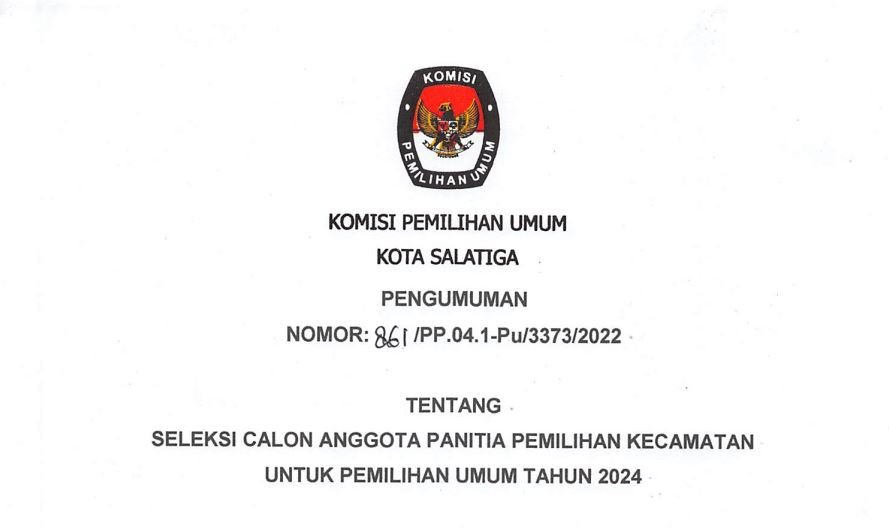 Dalam rangka pembentukan Panitia Pemilihan Kecamatan untuk Pemilihan Umum, Komisi Pemilihan Umum Kota Salatiga mengundang Warga Negara Indonesia yang memenuhi persyaratan untuk mendaftarkan diri menjadi anggota Panitia Pemilihan Kecamatan untuk Pemilihan Umum dengan ketentuan sebagai berikut :