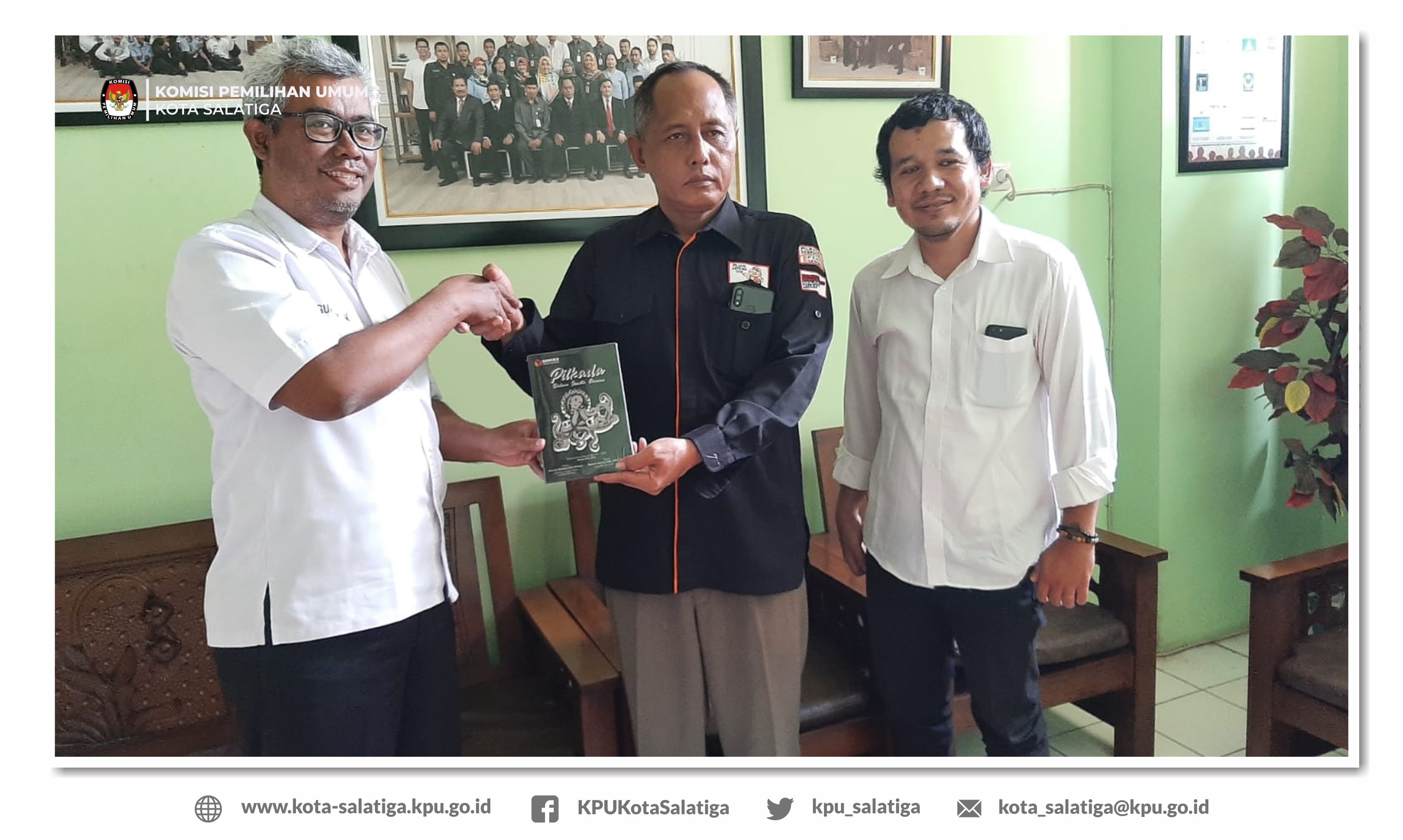 Diterima Ketua KPU Kota Salatiga Syaemuri, Ketua Bawaslu Kota Salatiga Agung Ari Mursito, bersama Dhomiri (anggota) menyerahkan buku tersebut. Buku adalah kumpulan tulisan hasil pengawasan Komisioner Bawalu dari 35 kab/kota se Jawa Tengah.