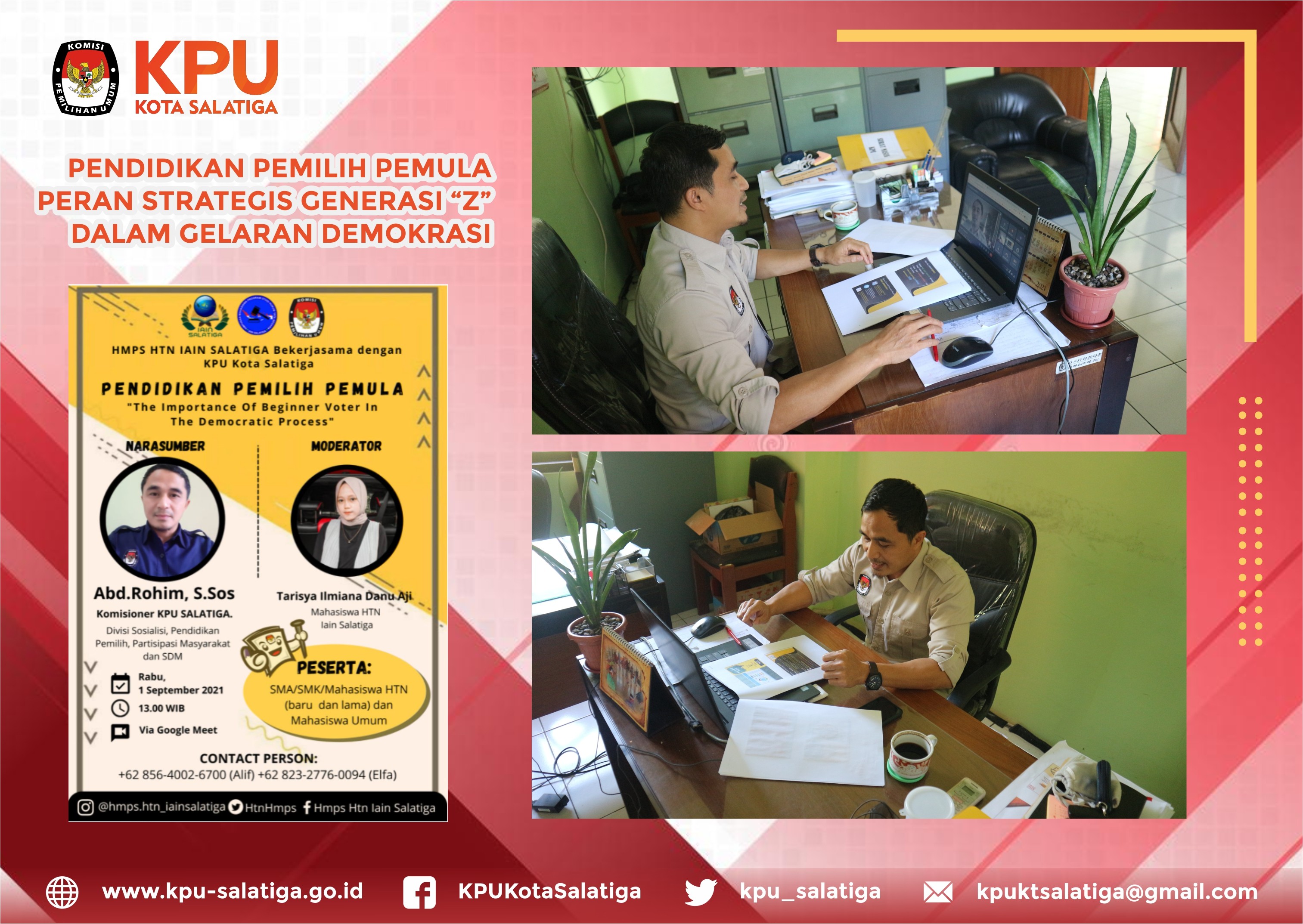 Salatiga- Pemilih pemula selalu menjadi basis pemilih yang menarik dalam setiap gelaran pemilu maupun pemilihan. Baik oleh penyelenggara pemilu sebagai sasaran sosialiasi dan pendidikan pemilih, tapi juga oleh peserta pemilu atau pasangan calon sebagai basis kantong suara yang besar. Hal ini yang menjadi bahasan dalam kegiatan webinar yang di selenggarakan oleh Himpunan Mahasiswa Hukum Tata Negara IAIN dan KPU Kota Salatiga.