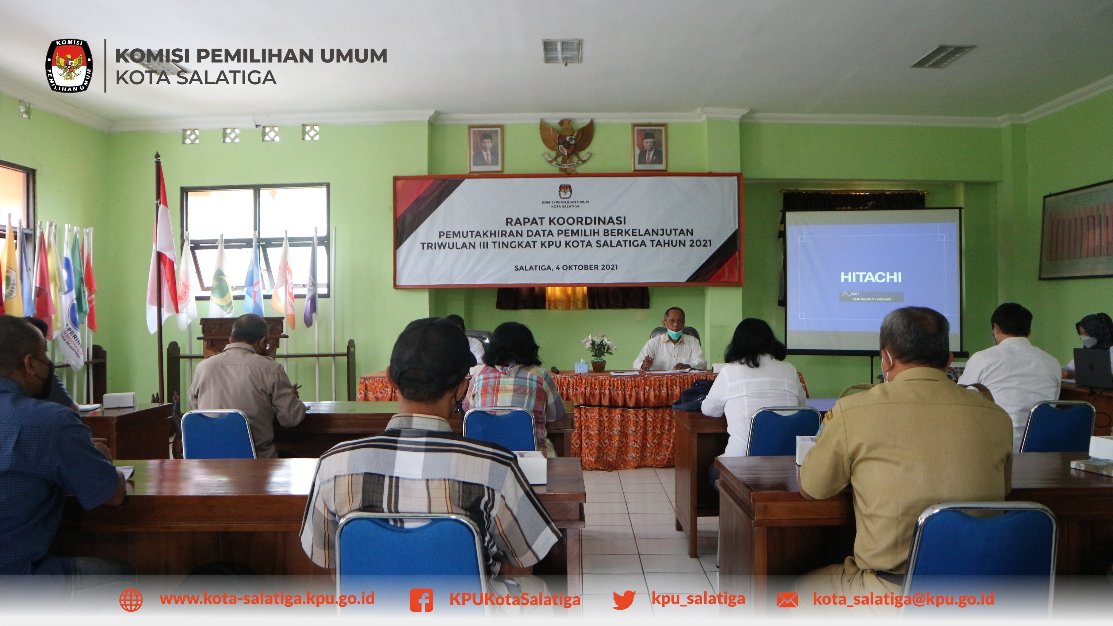 Senin (4/10/2021) di Aula KPU Kota Salatiga, diselenggarakan Rapat Koordinasi Daftar Pemilih Berkelanjutan (DPB) Tahun 2021 periode Triwulan ke-3. Rakor dibuka dan ditutup oleh Ketua KPU Kota Salatiga, Syaemuri.