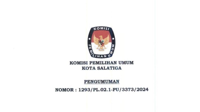 Berdasarkan Berita Acara Komisi Pemilihan Umum Kota Salatiga Nomor 583/PL.02.1-BA/3373/2024 tanggal 18 September 2024 tentang Rekaputilasi Daftar Pemilih Tetap (DPT) Tingkat Kota Salatiga Pemilihan Gubernur dan Wakil Gubernur Jawa Tengah serta Pemilihan Walikota dan Wakil Walikota Salatiga Tahun 2024, dengan ini diumumkan Daftar Pemilih Tetap (DPT) Tingkat Kota Salatiga dalam Pemilihan Serentak Tahun 2024 sebagaimana tercantum dalam lampiran pengumuman ini.