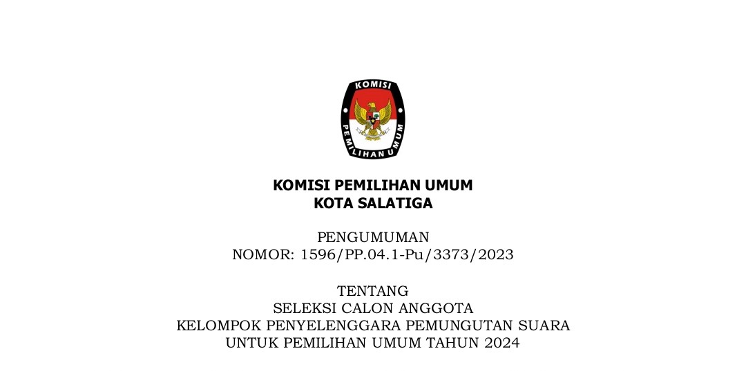 Dalam rangka pembentukan Kelompok Penyelenggara Pemungutan Suara (KPPS) untuk Pemilihan Umum Tahun 2024, Komisi Pemilihan Umum Kota Salatiga mengundang Warga Negara Indonesia yang memenuhi persyaratan untuk mendaftarkan diri menjadi anggota KPPS untuk Pemilihan Umum Tahun 2024 dengan ketentuan yang dapat diunduh pada tautan berikut