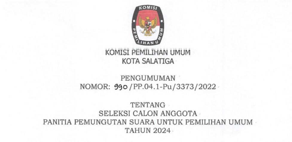 Dalam rangka pembentukan Panitia Pemungutan Suara untuk Pemilihan Umum, Komisi Pemilihan Umum Kota Salatiga mengundang Warga Negara Indonesia yang memenuhi persyaratan untuk mendaftarkan diri menjadi anggota Panitia Pemungutan Suara untuk Pemilihan Umum dengan ketentuan sebagai berikut: