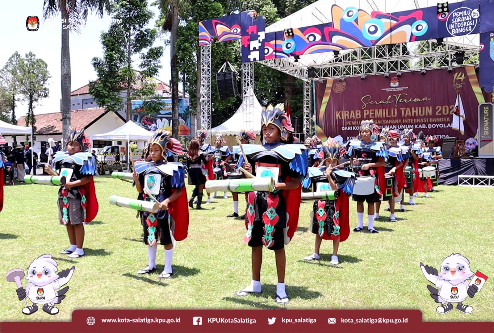 kota-salatiga.kpu.go.id- Kesenian khas Salatiga Drumblek dan Tari Tumpang Koyor meramaikan giat serah terima kirab pemilu 2024 di Salatiga (28/10).