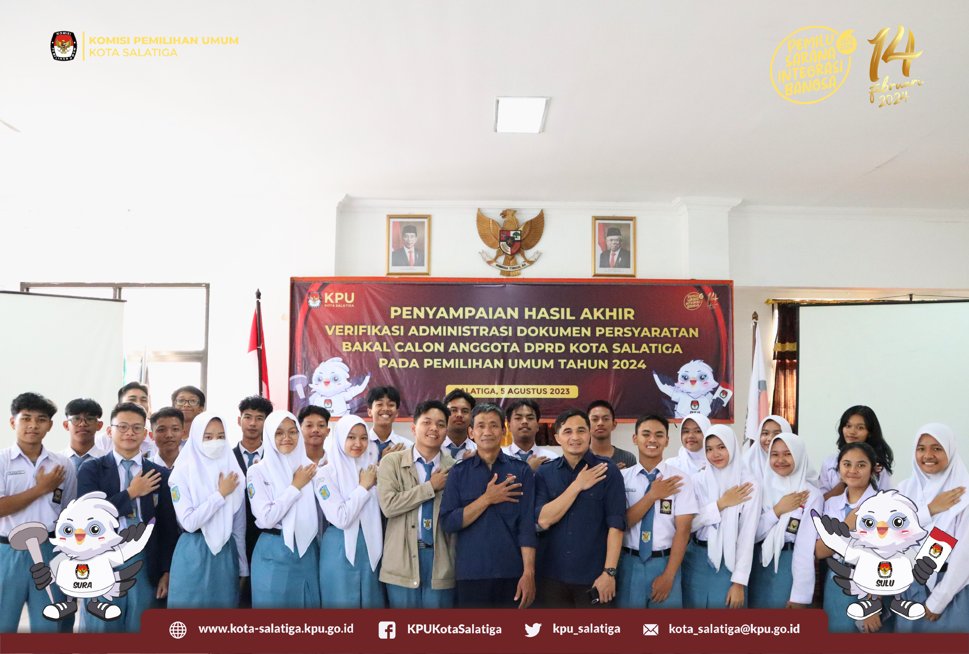 Sebanyak 25 siswa kelas 11 SMA Negeri 1 Salatiga, hadir di Aula KPU Kota Salatiga, Selasa (29/8). Sebagai narasumber Abd. Rohim selaku Divisi Sosialisasi dan Parmas memberikan pengenalan terhadap konsep dasar penyelenggaraan pemilu yang juga bisa dipedomani siswa dalam menyelenggarakan Pilketos di sekolahnya.