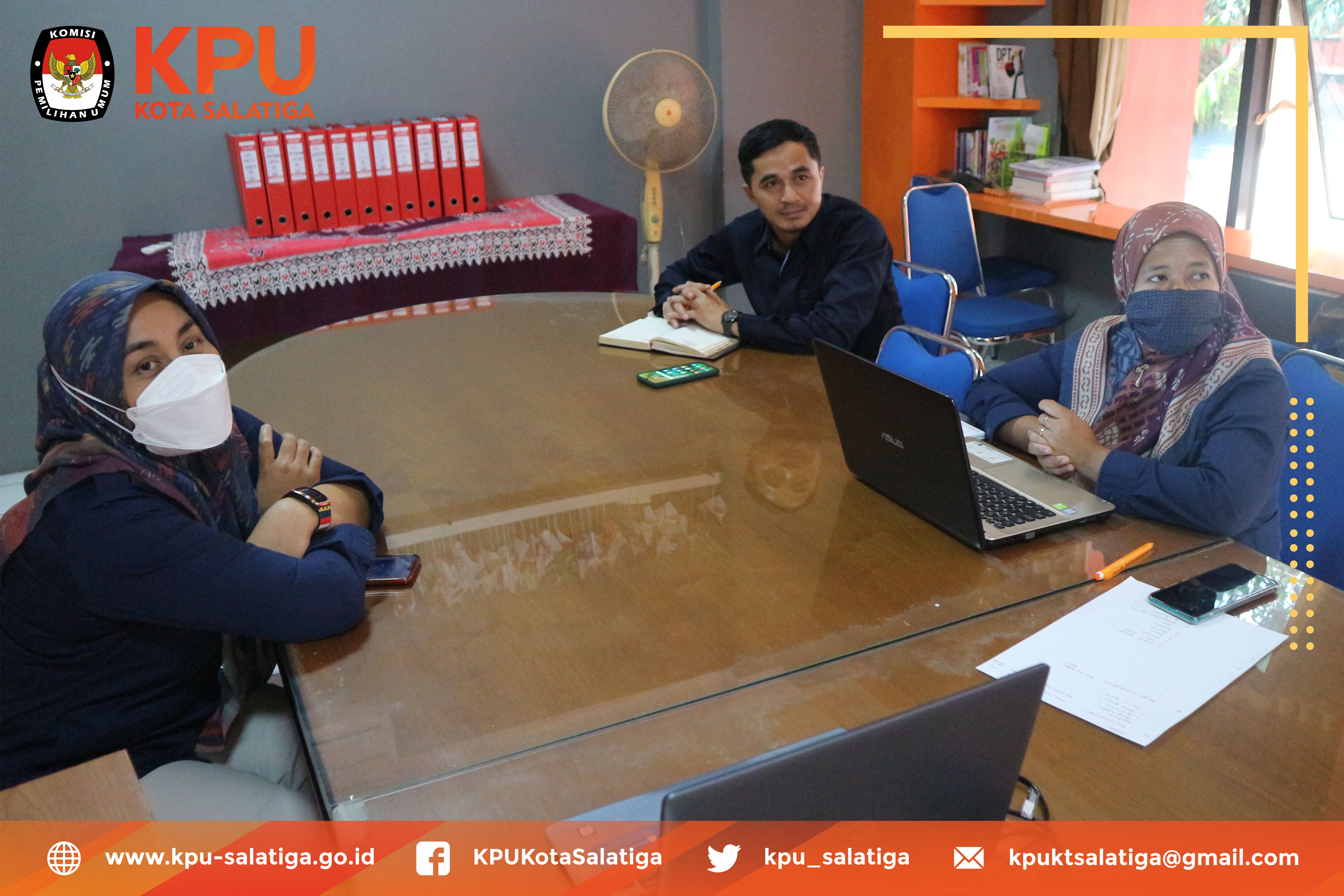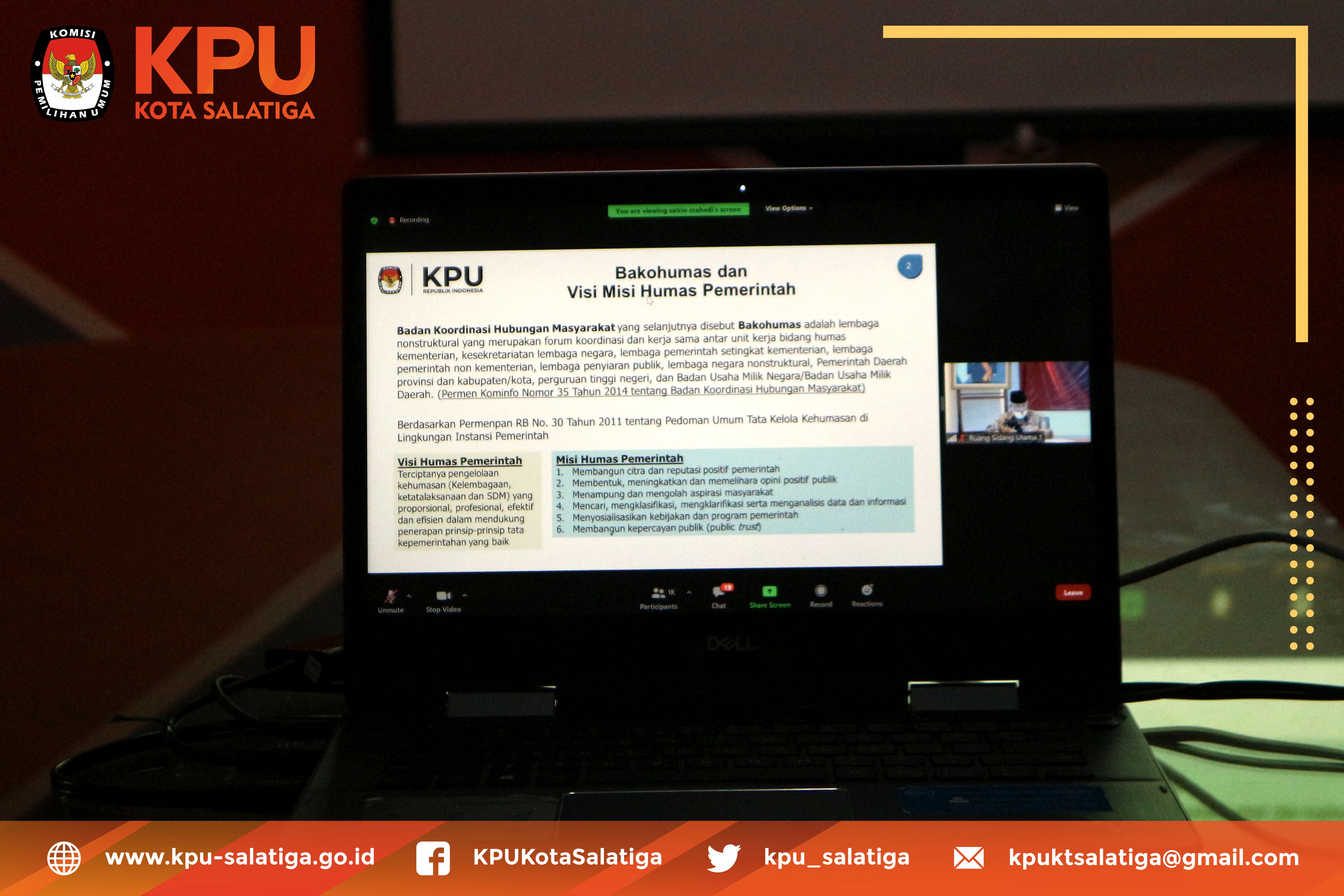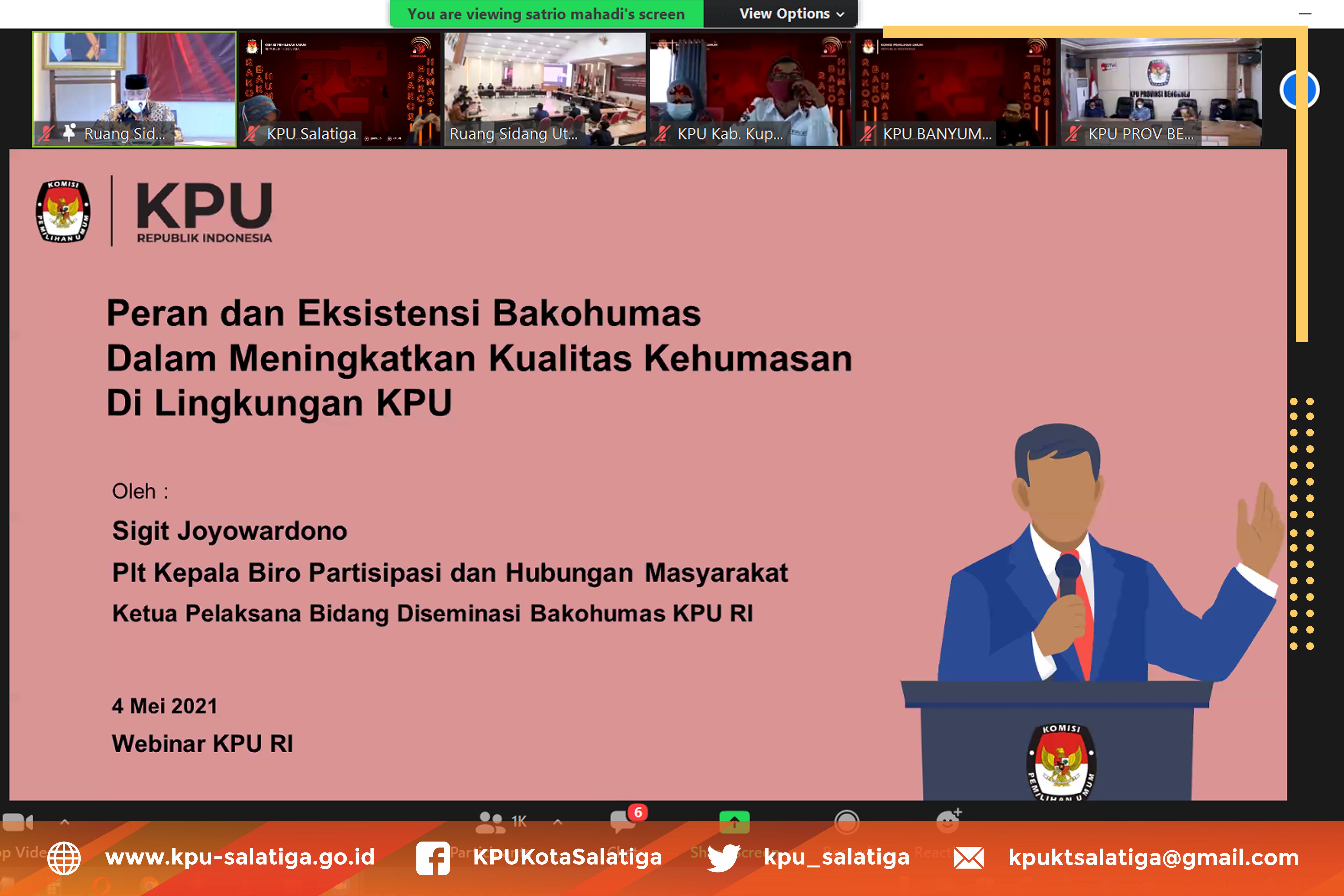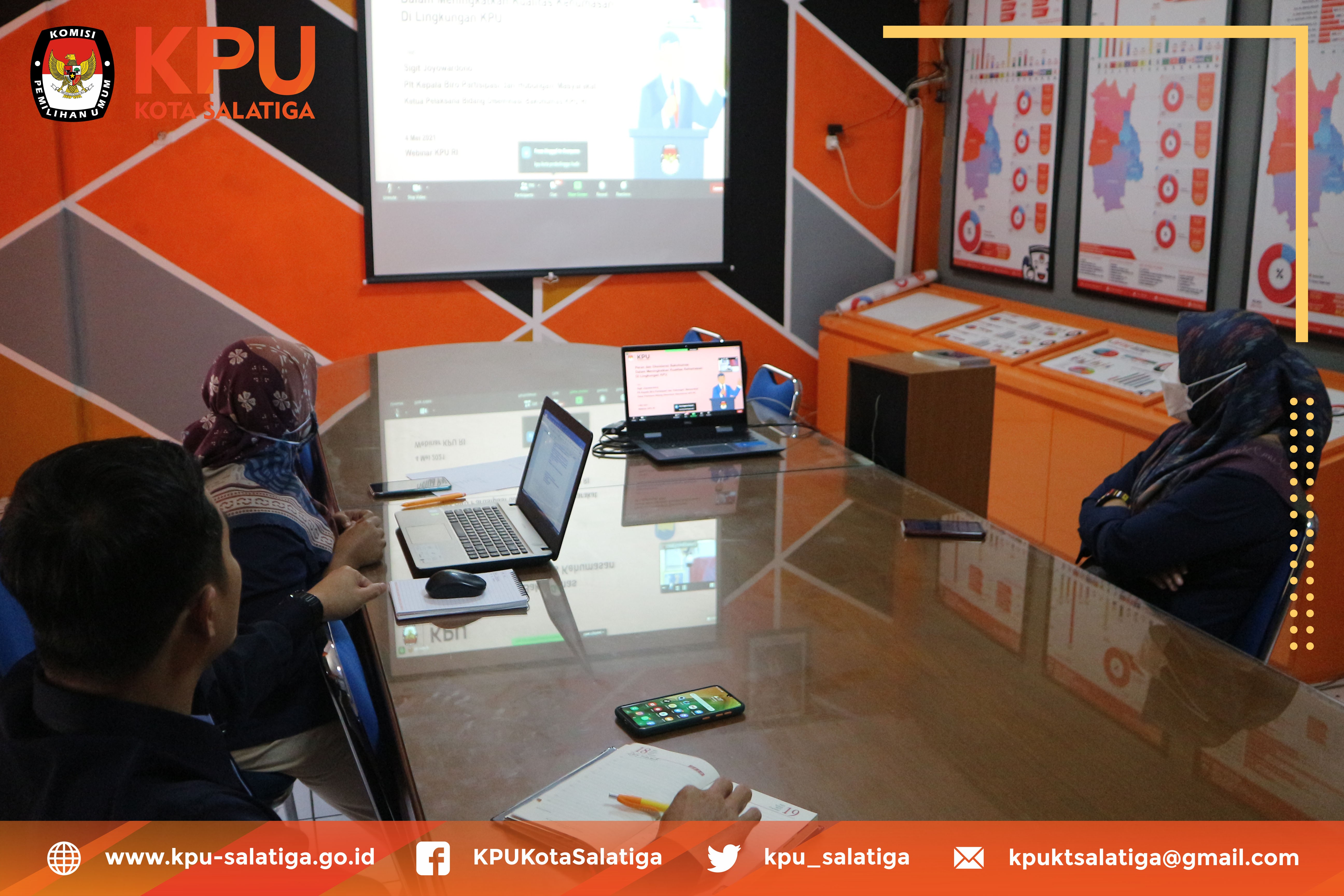Selasa (4/5) KPU Kota Salatiga mengikuti kegiatan Rakor Bakohumas dengan tajuk “Peningkatan Peran Eksistensi Bakohumas KPU RI, KPU Provinsi/KIP Aceh dan KPU Kab/Kota”. Hadir dalam kegiatan tersebut adalah Ketua, Divisi Sosdiklih Parmas, Sekretaris dan Kasubbag Teknis Hupmas. Rakor Bakohumas ini diselenggarakan KPU RI dan diikuti oleh KPU Provinsi dan KPU Kab/Kota Se - Indonesia.
