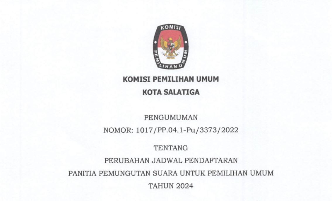 Sehubungan dengan terbitnya Keputusan Komisi Pemilihan Umum Nomor 534 Tahun 2022 tentang Perubahan atas Keputusan Komisi Pemilihan Umum Nomor 4 76 Tahun 2022 tentang Pedoman Teknis Pembentukan Badan Adhoc Penyelenggara Pemilihan Umum dan Pemilihan Gubemur dan Wakil Gubernur, Bupati dan Wakil Bupati, dan Walikota dan Wakil Walikota yang mengatur mengenai perubahan jadwal pembentukan PPS di dalamnya dengan ini, KPU Kota Salatiga menyampaikan hal-hal sebagai berikut :