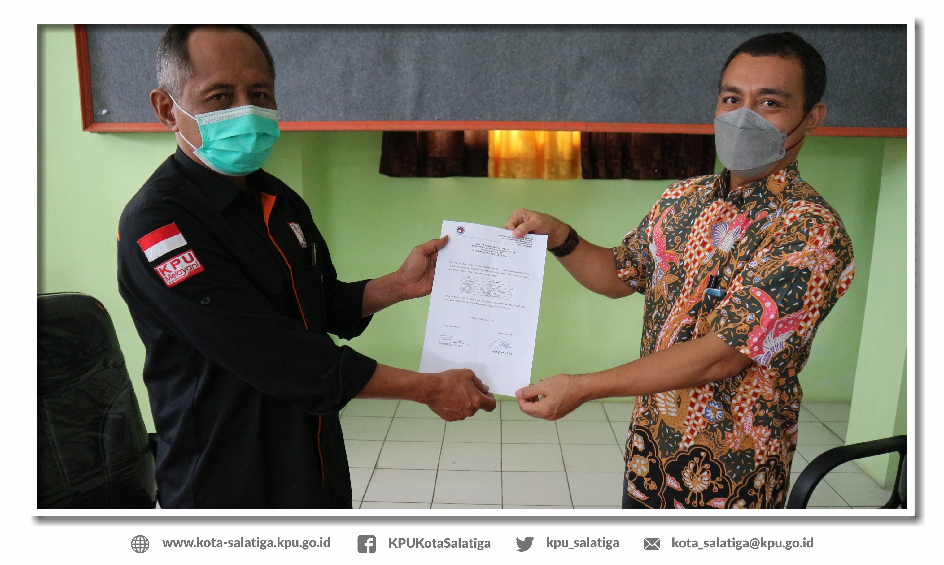 Rabu, 6 Oktober 2021, KPU Kota Salatiga menerima penyerahan mahasiswa magang dari Pusat Study Hukum dan Teori Konstitusi (PSHTK) Uiversitas Kristen Satya Wacana (UKSW). Penyerahan mahasiswa magang dilakukan oleh Direktur PSHTK UKSW, Dr. Umbu Rauta, S.H., M.Hum dan diterima oleh Ketua KPU Kota Salatiga Syaemuri, S.Ag. beserta jajaran Komisioner.